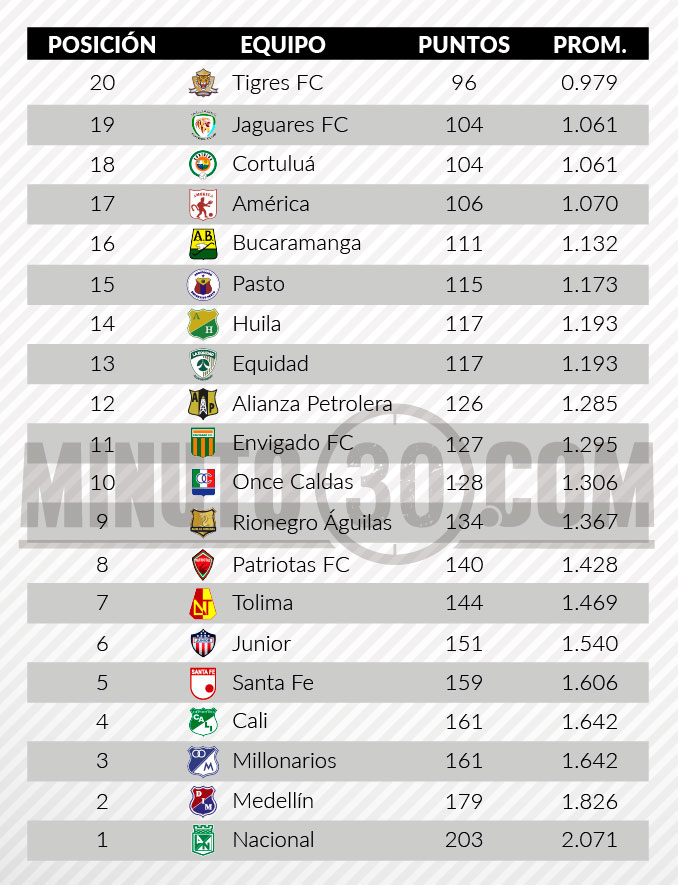 En serio riesgo quedó Cortuluá, pues su derrota ante Atlético Nacional en condición de local puso al elenco valluno en una posición bastante incomoda al igualar en promedio con Jaguares y ubicarse en peligro de descenso directo.