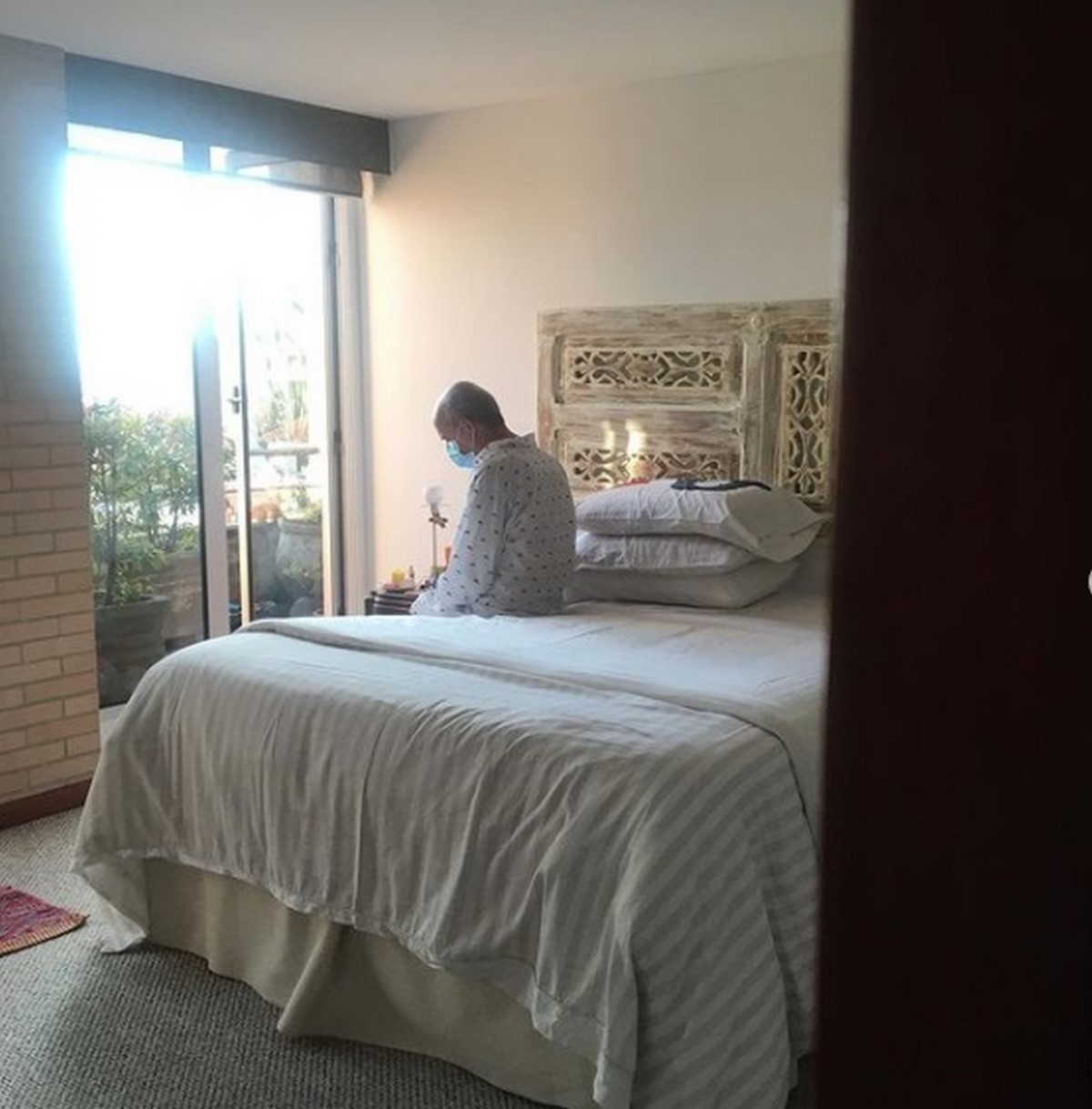 Con dos fotografías en la que se veía el actor en su habitación, Patricia aseguró: “seguiremos cuidándonos y guardando las distancias aunque ya estar los dos en casa es un regalo infinito”.