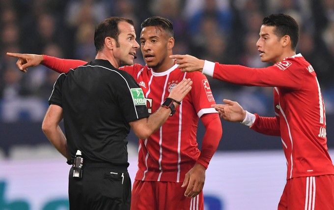El arbitro Marco Fritz (i) discute con los jugadores del Bayer Corentin Tolisso (c) y James Rodríguez (d)