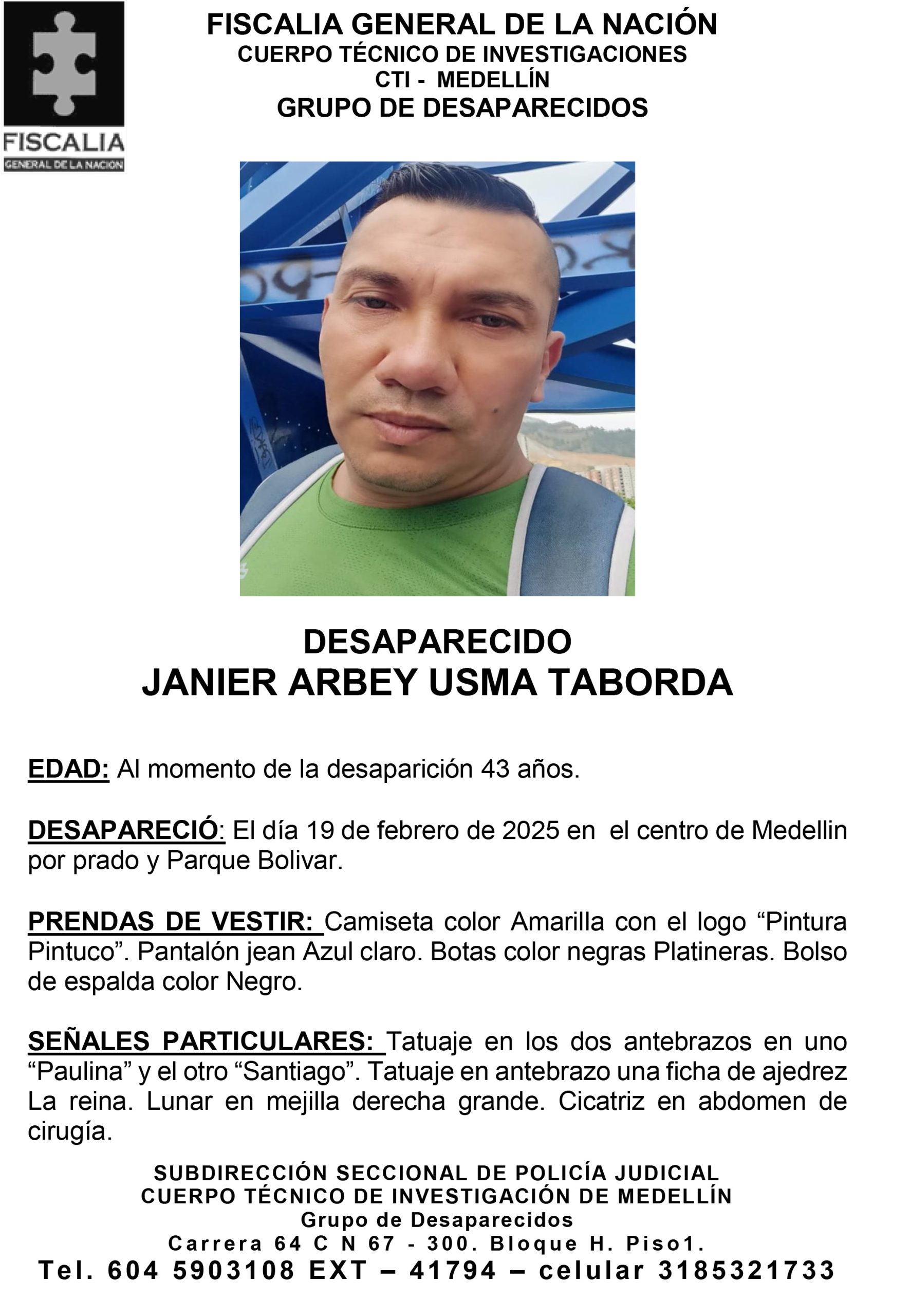 Janier Arbey Usma Taborda, de 43 años al momento de su desaparición, fue visto por última vez el 19 de febrero de 2025 en el centro de Medellín, específicamente en las zonas de Prado y Parque Bolívar.