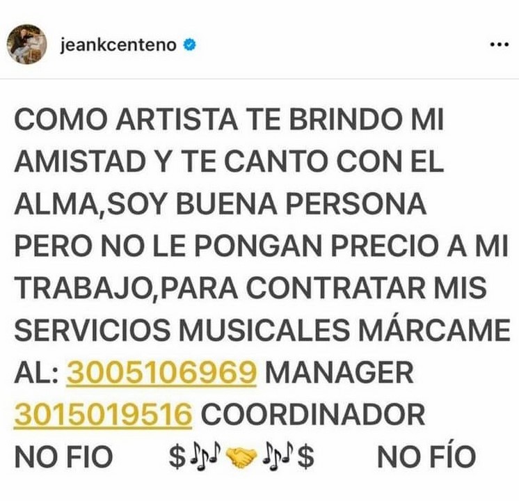 El cantante vallenato Jean Carlos Centeno, reconocido como una de las mejores voces del folclor se ha desahogado en redes sociales en relación a aquellos que le han hecho pasar situaciones incómodas al momento de pagarle lo que valen sus presentaciones.