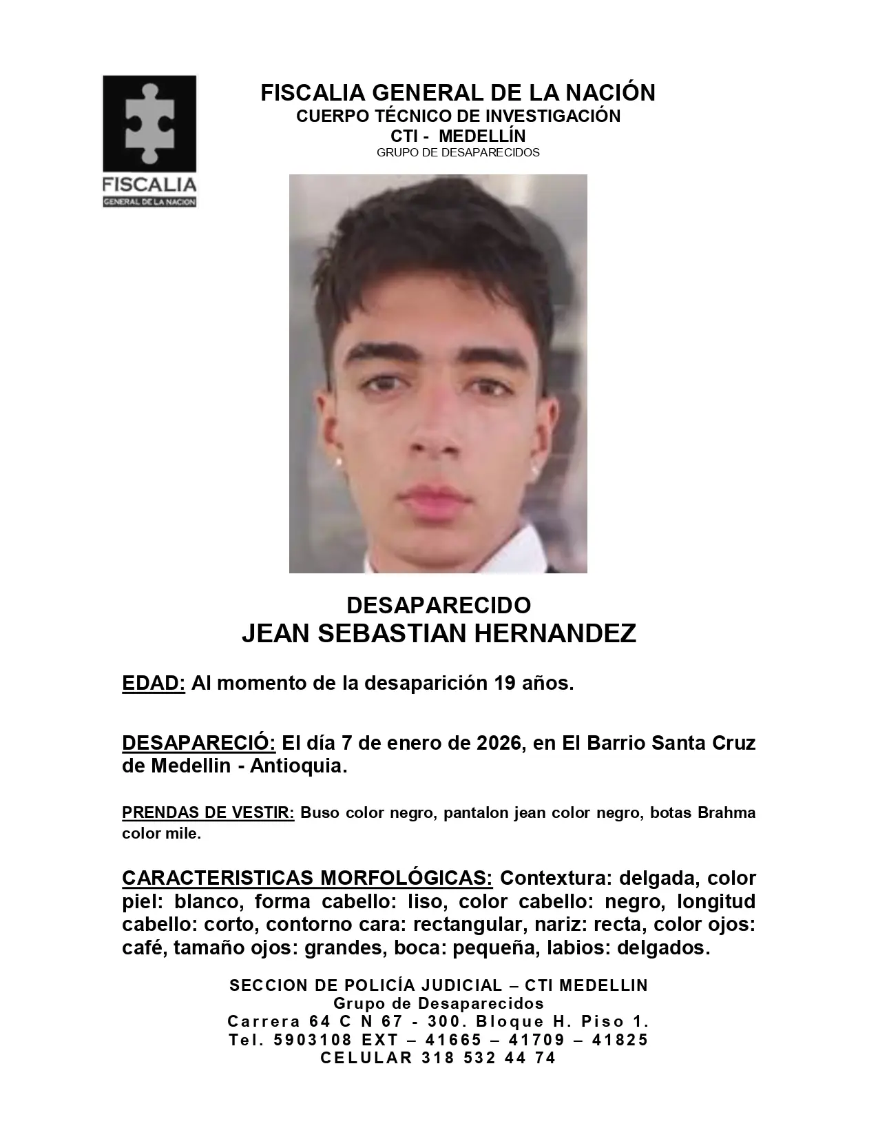 Si usted tiene información que permita dar con la ubicación de Jean Sebastian Hernández, por favor comuníquese de inmediato con el Grupo de Desaparecidos del CTI de la Fiscalía: