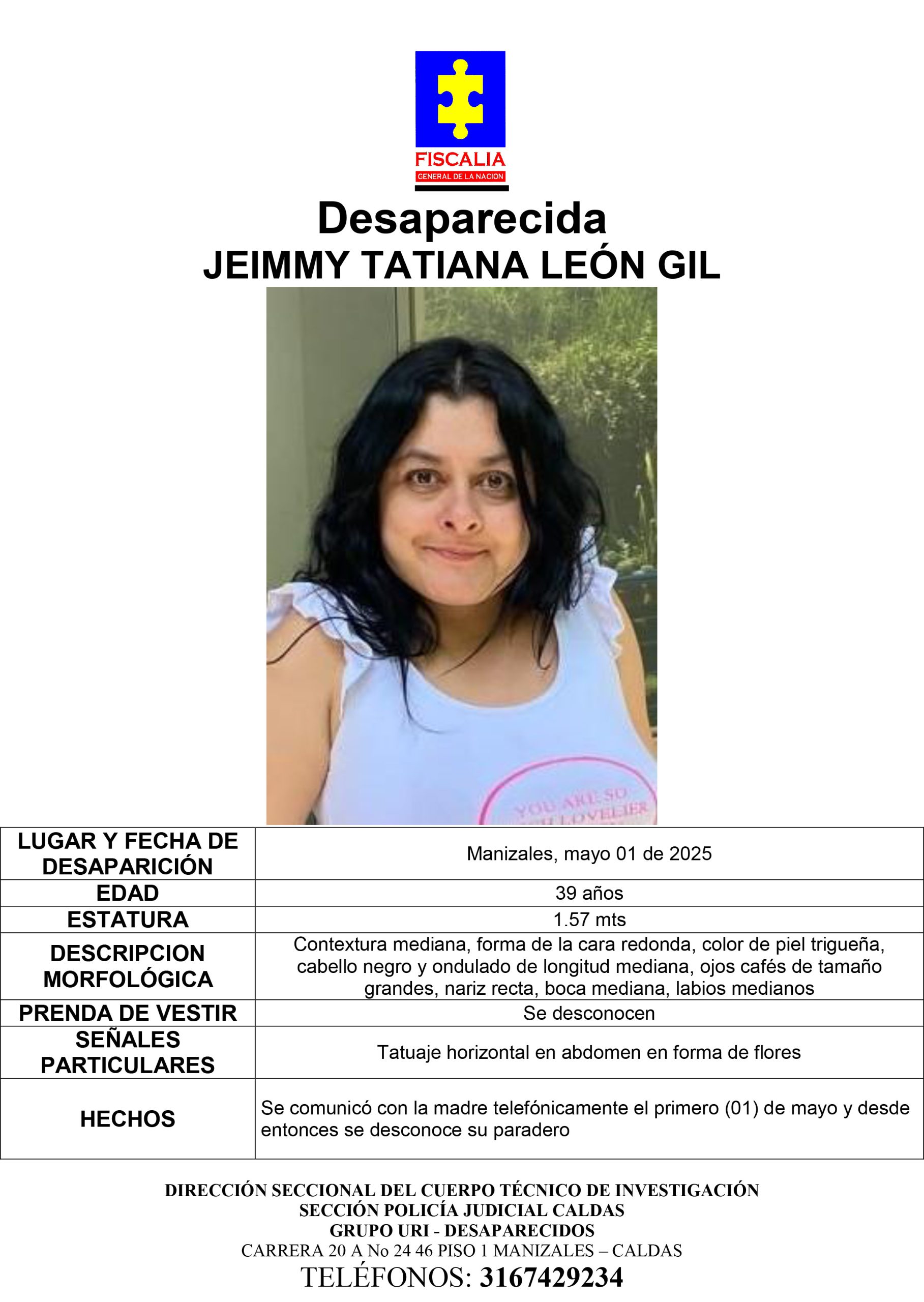 Resumen: Jeimmy Tatiana León Gil, de 39 años de edad, fue reportada como desaparecida en la ciudad de Manizales el 1 de mayo de 2025.
