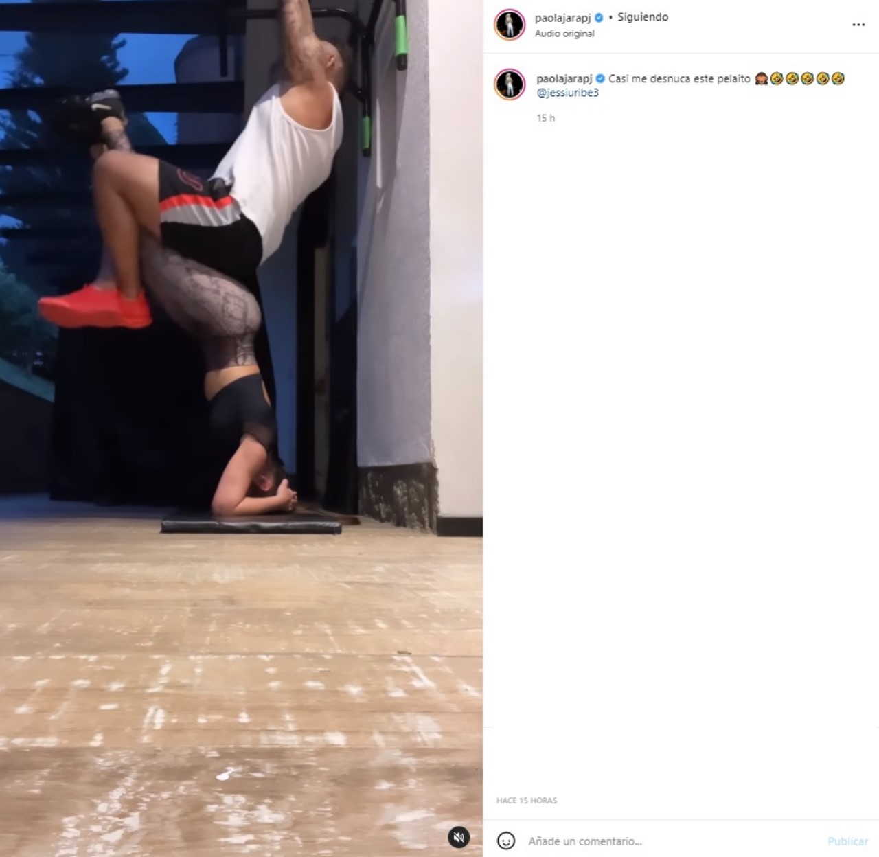 Paola al parecer quería grabar el momento en el que se estaba parando de cabeza, frente al lente de la cámara usando un ajustado atuendo deportivo. A los segundos llegó Jessi Uribe, aprovechó y se le agarró con sus piernas