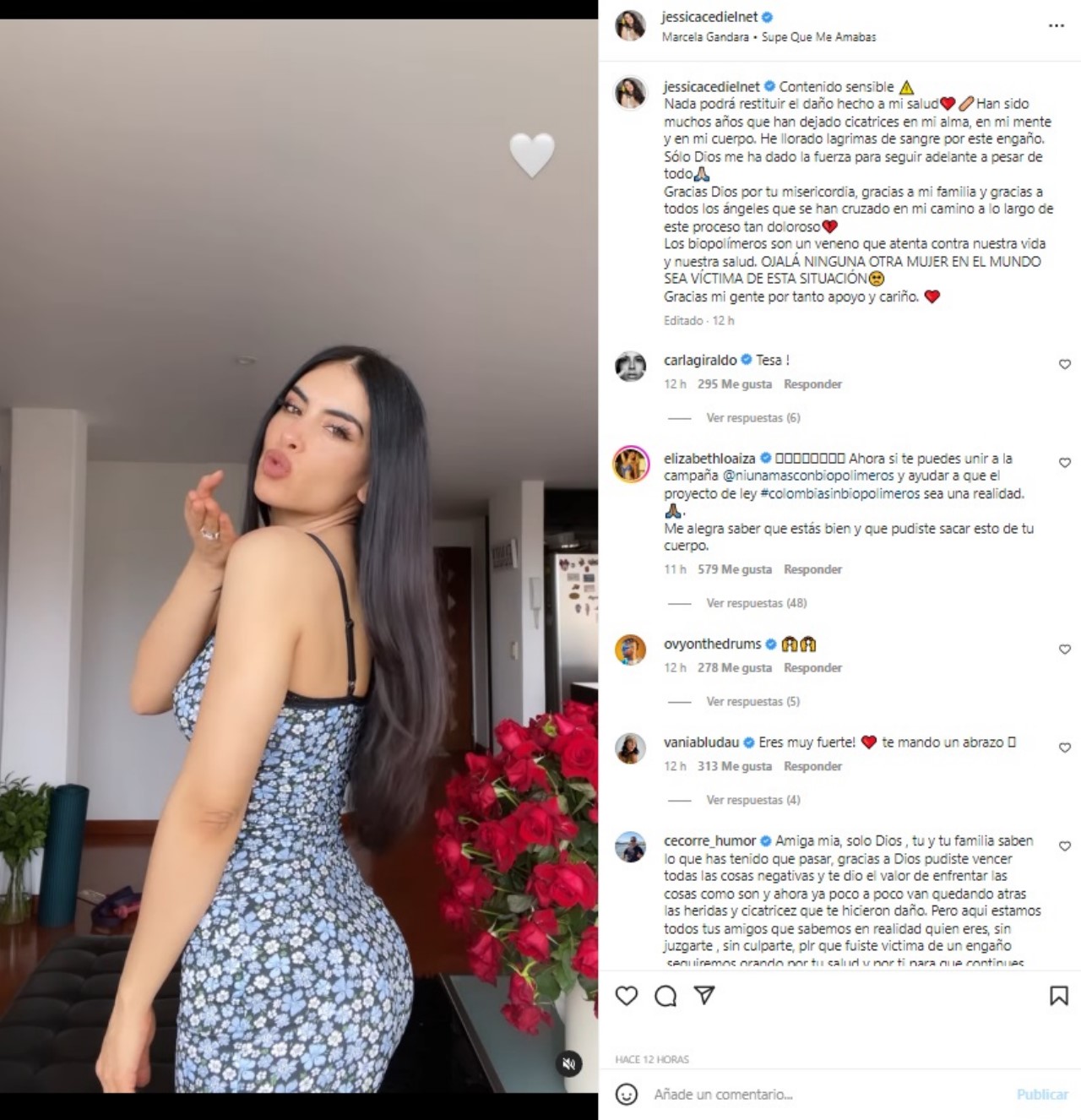 “Nada podrá restituir el daño hecho a mi salud. Han sido muchos años que han dejado cicatrices en mi alma, en mi mente y en mi cuerpo. He llorado lagrimas de sangre por este engaño. Sólo Dios me ha dado la fuerza para seguir adelante a pesar de todo”, escribió Jessica Cediel en el post.