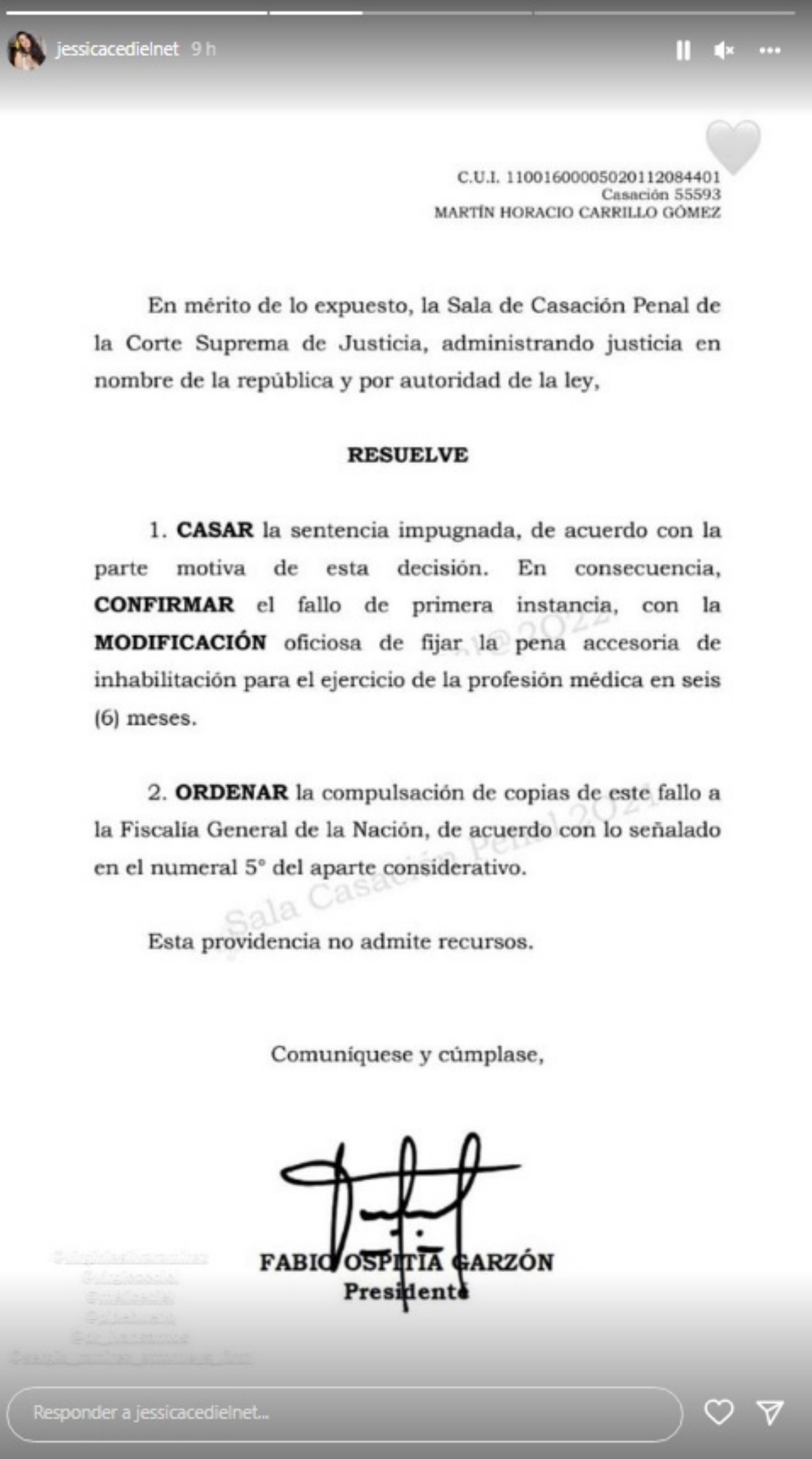 La presentadora y modelo Jessica Cediel revela el fuerte video de su extracción de biopolímeros en redes sociales, luego de que Sala Penal de la Corte Suprema de Justicia dejó en firme la condena de 48 meses de cárcel al médico Martín Horacio Carrillo Gómez; por implantar biopolímeros en 2009 a la presentadora Jessica Cediel.