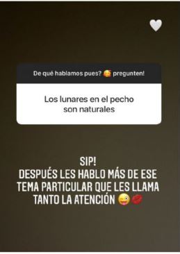 “¿Los lunares en el pecho son naturales?, le preguntó un fanático curioso en Instagram, por lo cual la estrella de las redes sociales respondió que sí, y que más adelante hablará sobre este tema “que les llama tanto la atención”.