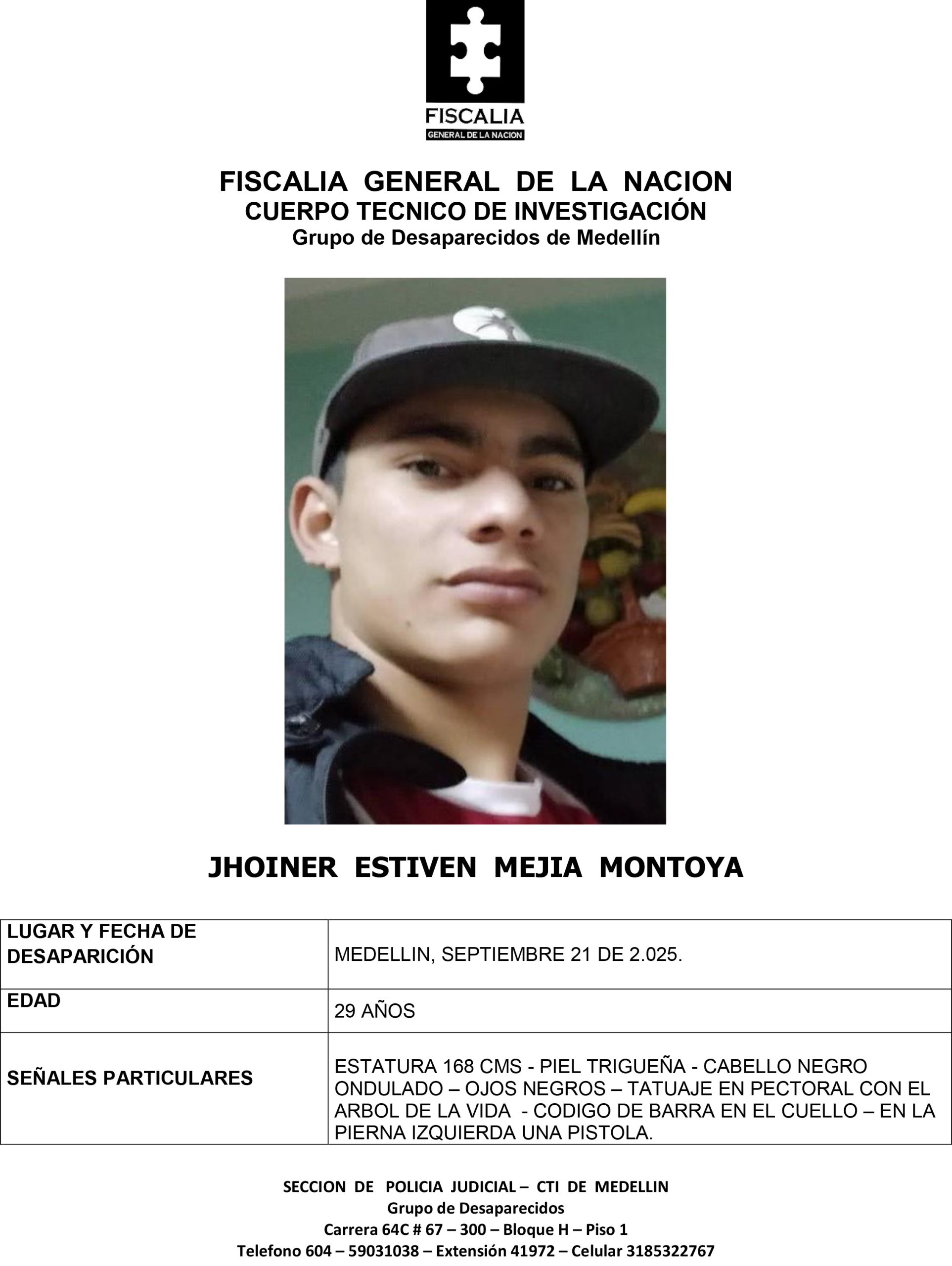 Jhoiner Estiven Mejía Montoya fue reportado como desaparecido en Medellín el 21 de septiembre de 2025. Al momento de su desaparición, tenía 29 años de edad.