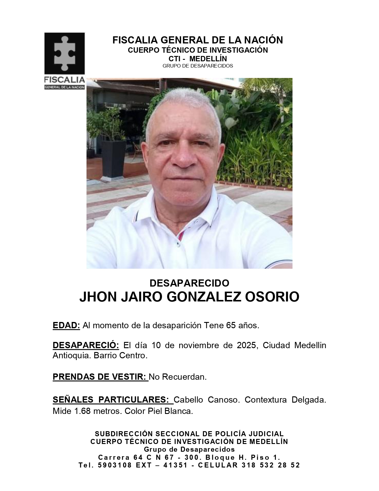 Minuto30.com .- Jhon Jairo González Osorio, de 65 años de edad, se encuentra desaparecido desde el pasado 10 de noviembre de 2025. Fue visto por última vez en el sector del Centro de la ciudad de Medellín, Antioquia.