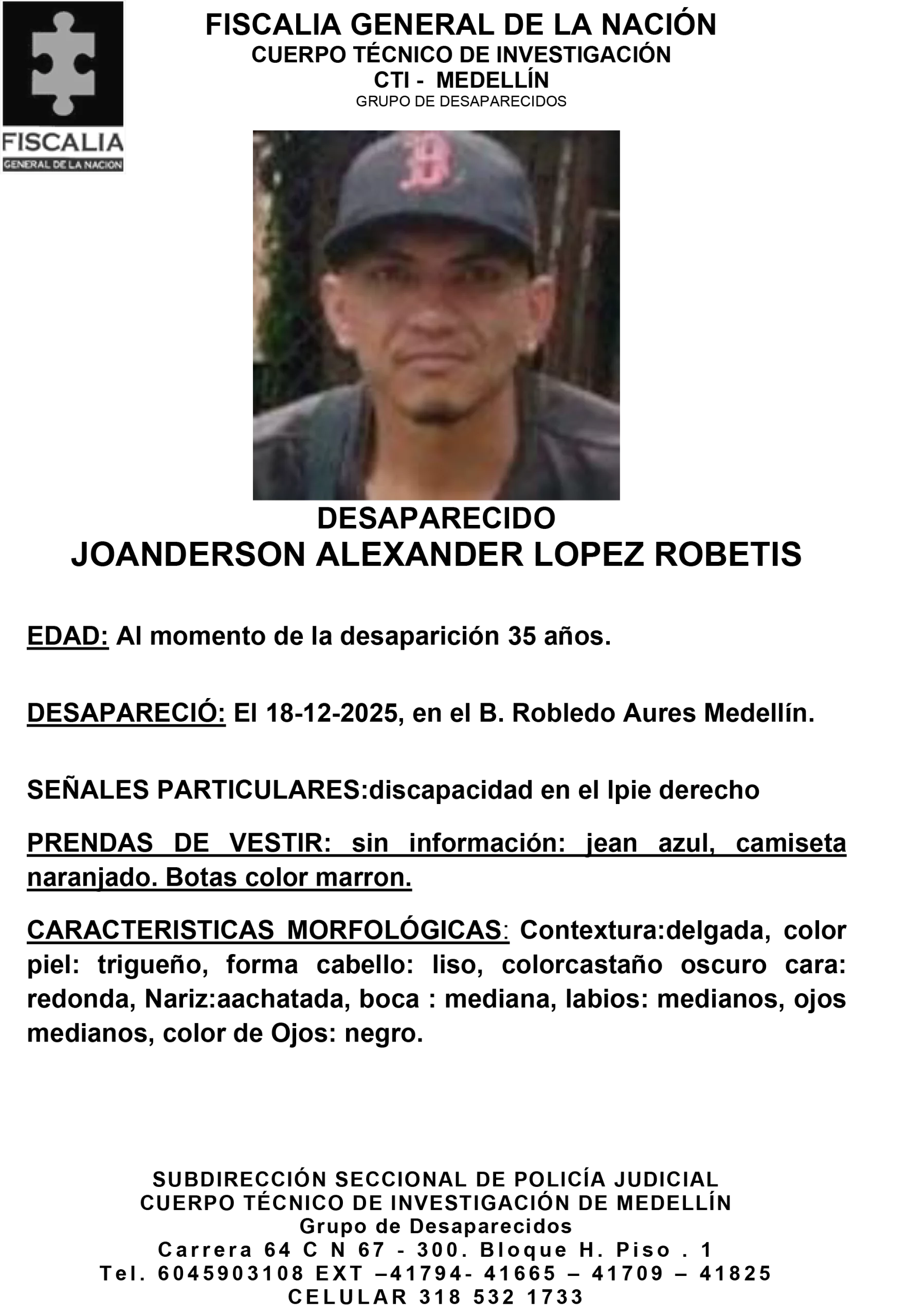 Joanderson Alexander López Robetis tenía 35 años al momento de su desaparición. Fue visto por última vez el 18 de diciembre de 2025 en el barrio Robledo Aures, en Medellín.