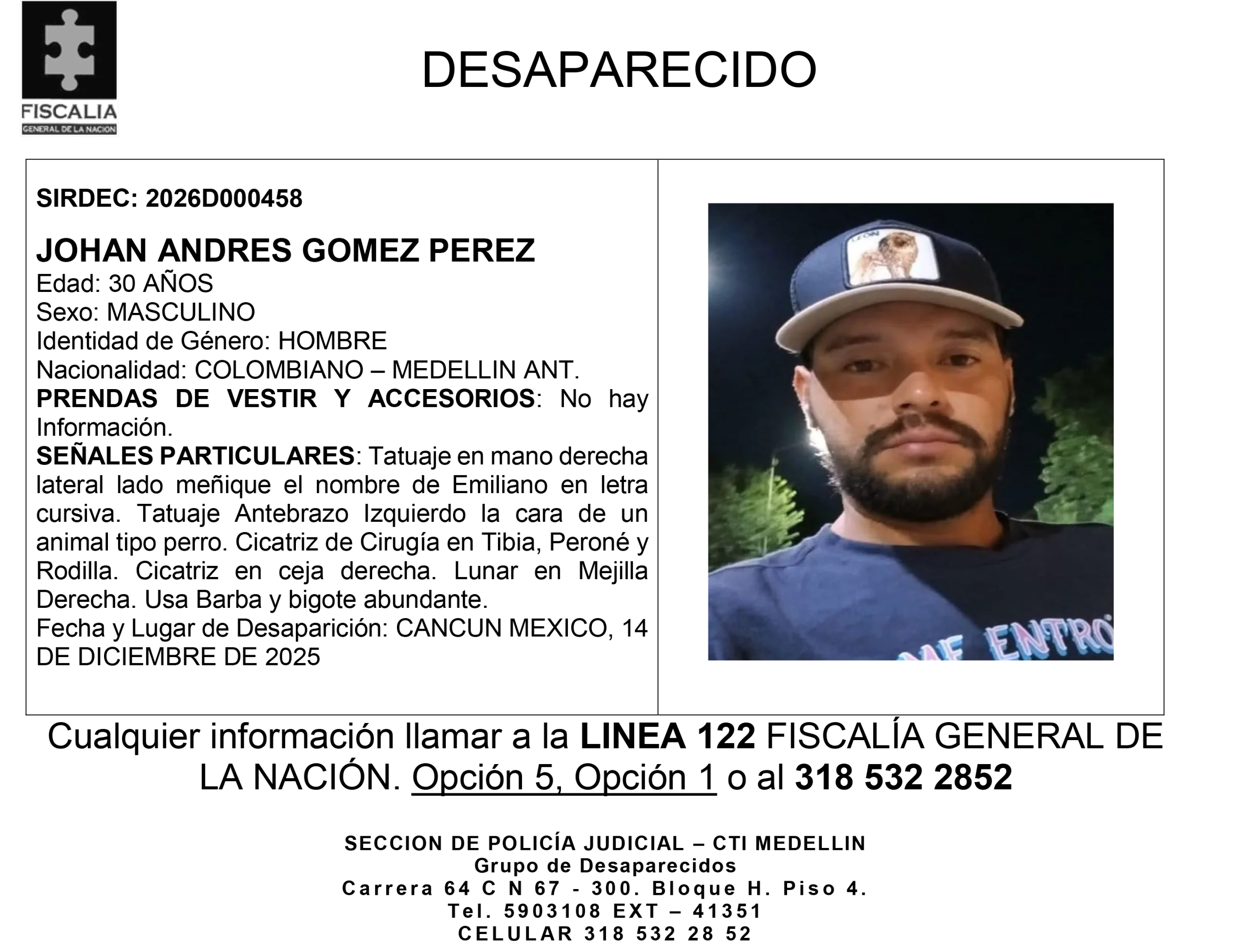 Johan Andrés Gómez Pérez es un hombre colombiano de 30 años, originario de Medellín, Antioquia. Se identifica como hombre y al momento de su desaparición no se contaba con información sobre la ropa o accesorios que llevaba puestos.