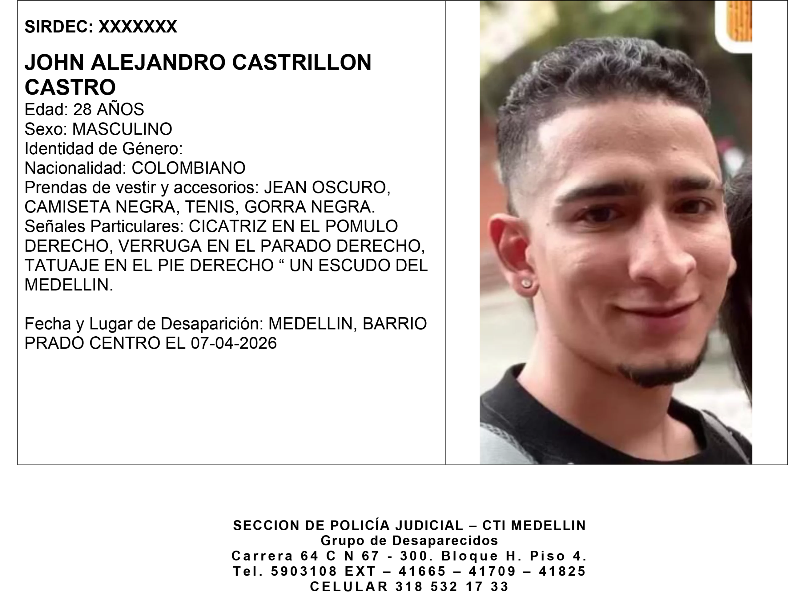 El día 07 de abril de 2026 desapareció en el barrio Prado Centro, en Medellín. En el momento de su desaparición vestía jean oscuro, camiseta negra, tenis y gorra negra. Estas prendas también pueden ayudar a reconocerlo o aportar información sobre sus últimos movimientos.