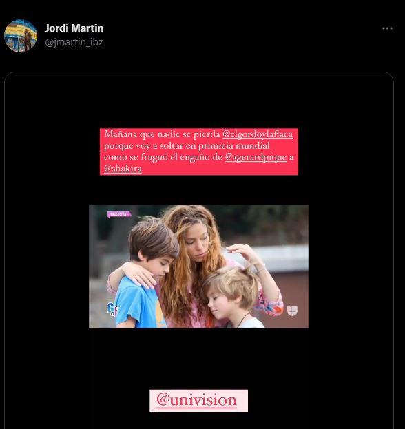 “Esta semana saldrán varias cosas que no dejan en buen lugar a Gerard. Yo sacaré dos infidelidades. Una de 2016 y la de Clara Chía Martí, que es terrible cómo engañó a Shakira. Es repugnante cómo se fraguó el engaño”, escribió el periodista, quien es también reconocido por estar cerca de la fallida relación por más de 12 años.