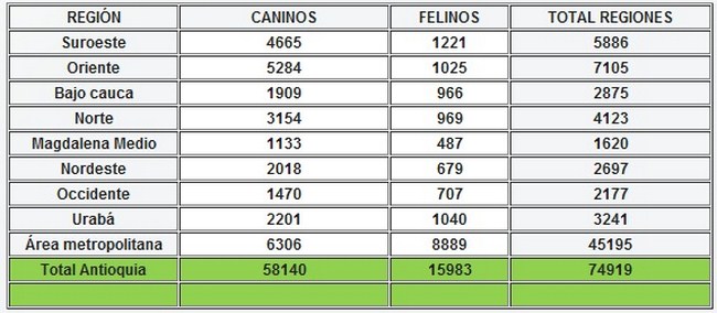 80 mil mascotas se vacunaron el primer día de la jornada de vacunación antirrábica en el departamento de Antioquia, 25% más de la meta esperada. En el departamento están contabilizados 381.508 animales (caninos 294.412 y felinos 87.096) y se presupuesta vacunar hasta el mes de noviembre el 90% de ellos, es decir 320 mil animales.