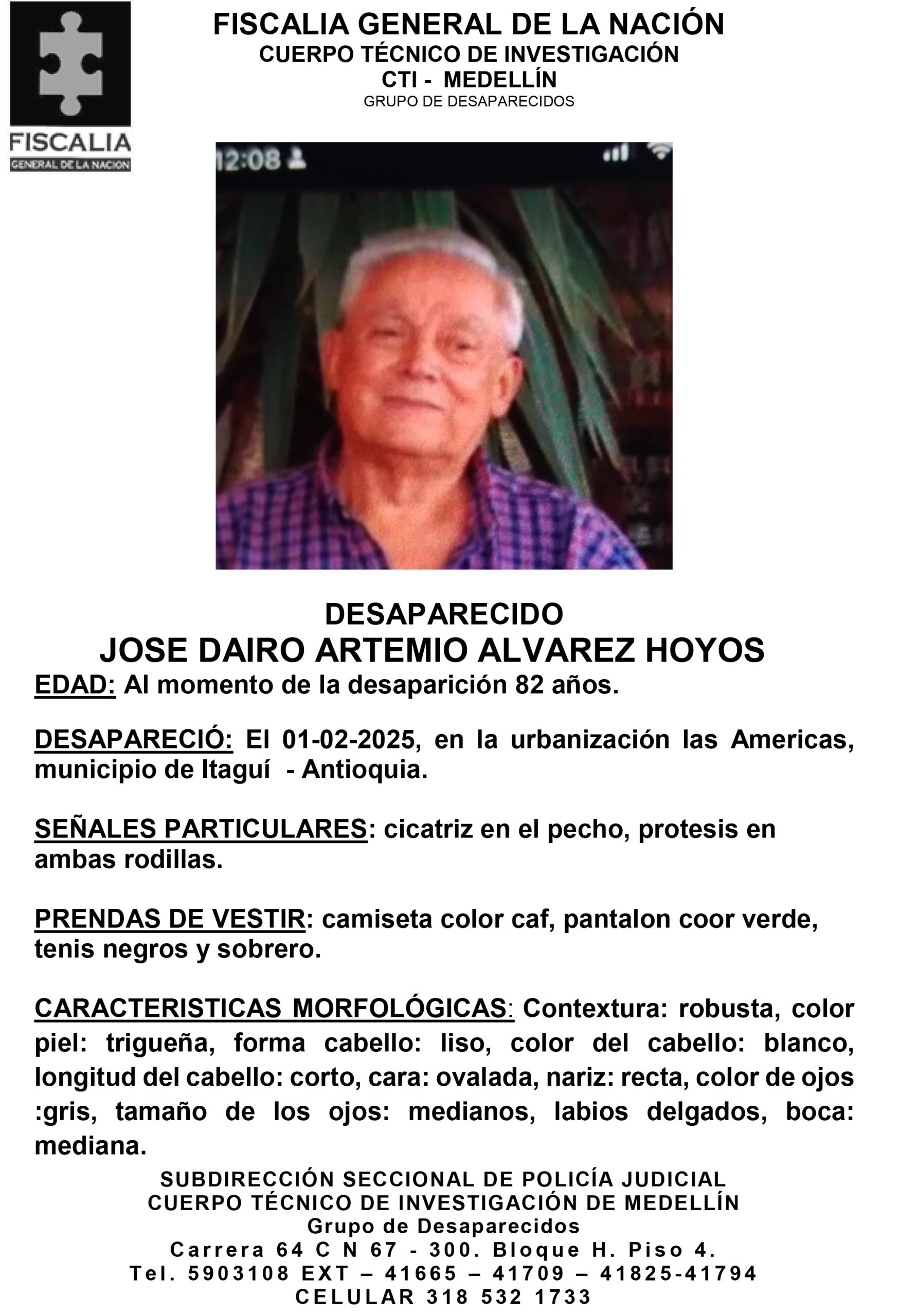 José Dairo Artemio Álvarez Hoyos, de 82 años al momento de su desaparición, desapareció el 1 de febrero de 2025 en la urbanización Las Américas, municipio de Itagüí, Antioquia.