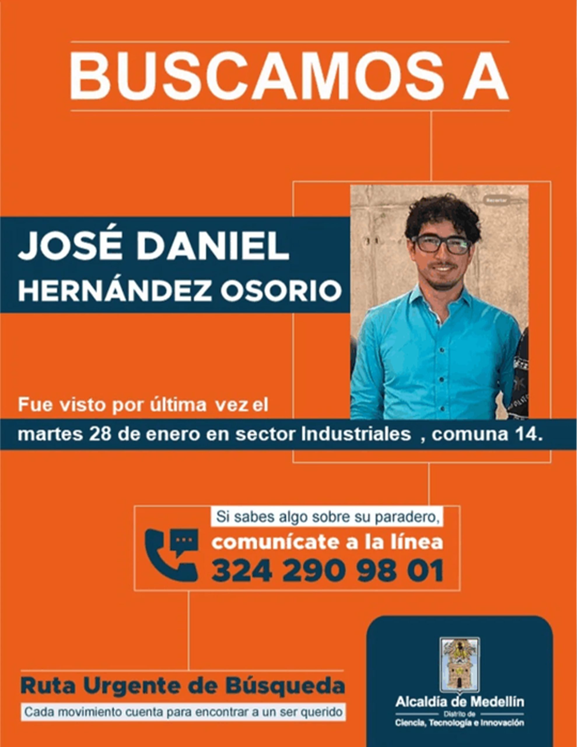 Resumen: José Daniel Hernández Osorio fue visto por última vez el martes 28 de enero en el sector Industriales, Comuna 14.