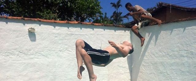 En la fotografía retrata el momento exacto en el que el hombre, armado con una pistola, salta el muro blanco de la casa, mientras el novio de la joven realiza una pirueta en la piscina.