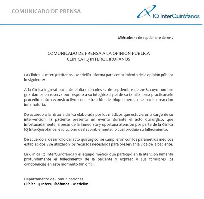 Según comunicado oficial del centro estético, la mujer pretendía practicarse un procedimiento reconstructivo con extracción de biopolímeros que hacían reacción inflamatoria.