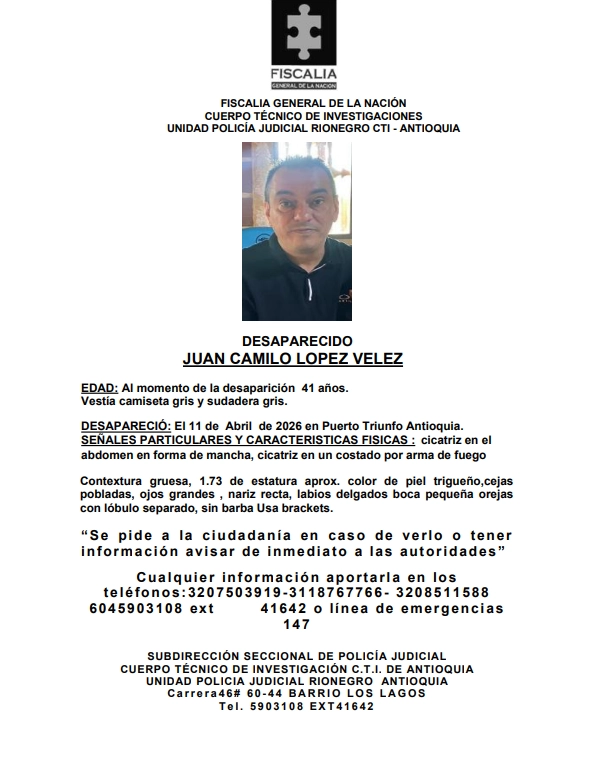 Resumen: El documento de la Fiscalía General de la Nación y el CTI de Rionegro (Antioquia) informa la desaparición de Juan Camilo López Vélez, de 41 años al momento de los hechos. Según el reporte, desapareció el 11 de abril de 2026 en Puerto Triunfo. En el momento de su desaparición vestía camiseta y sudadera de color gris.