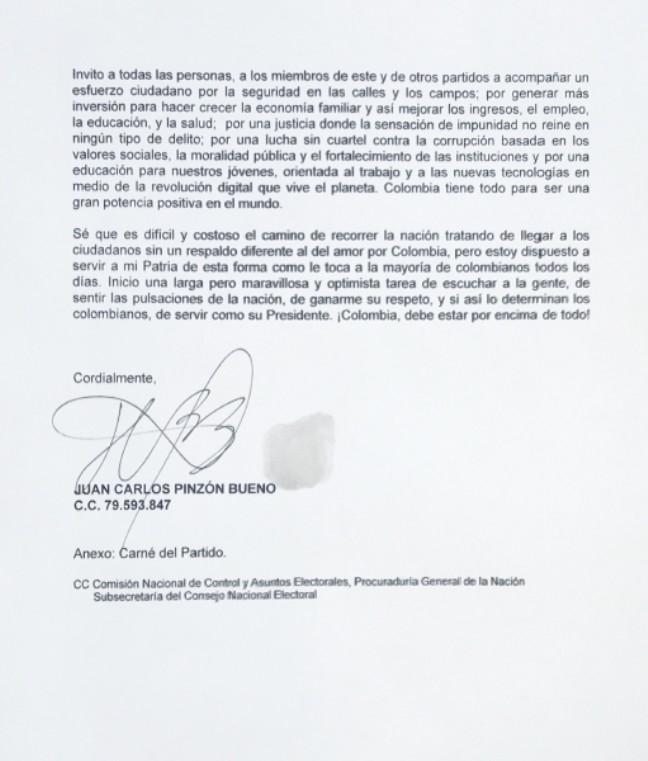 Juan Carlos Pinzón renuncia al Partido de La U y oficializa su candidatura a la Presidencia -Comunicado-
