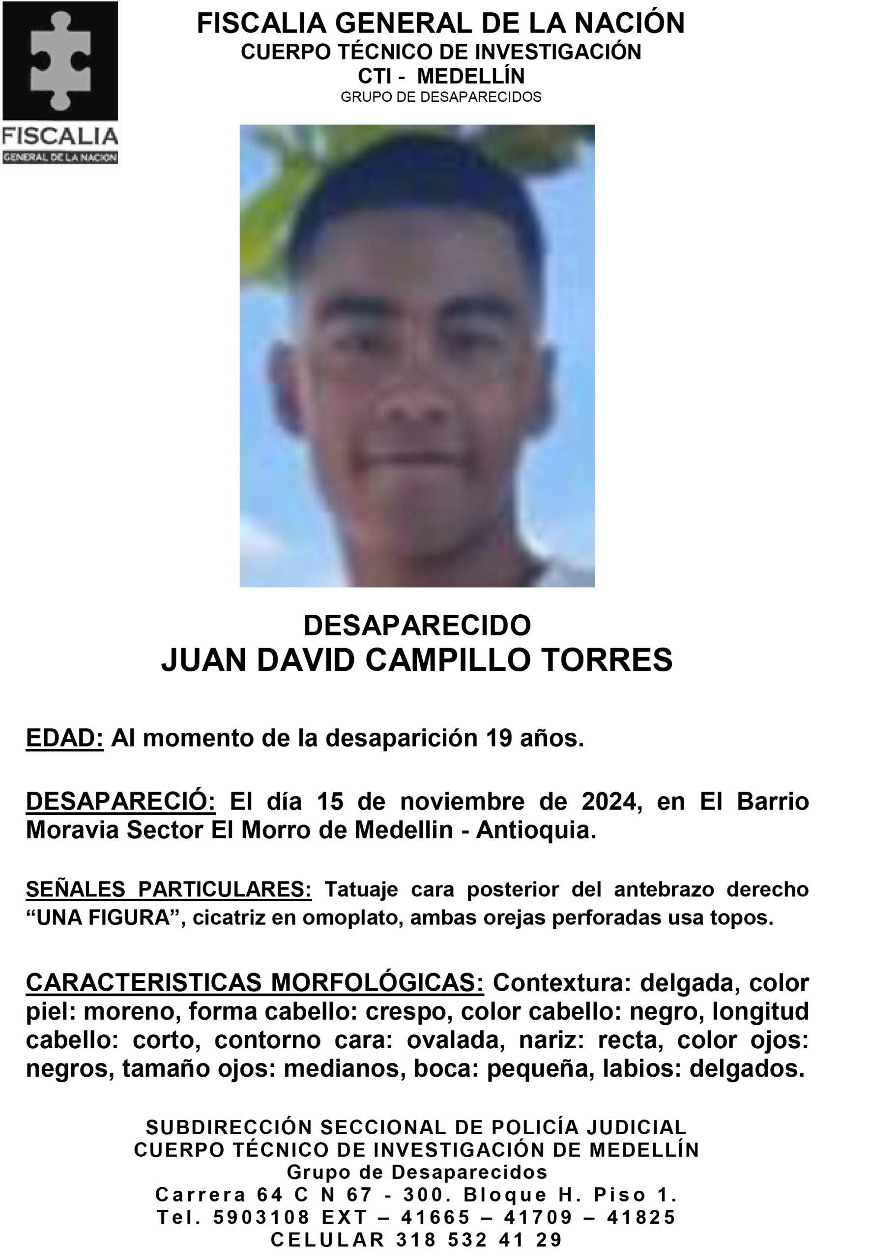Resumen: Juan David Campillo Torres, de 19 años, desapareció el 15 de noviembre de 2024 en el Barrio Moravia, Sector El Morro, en Medellín, Antioquia.