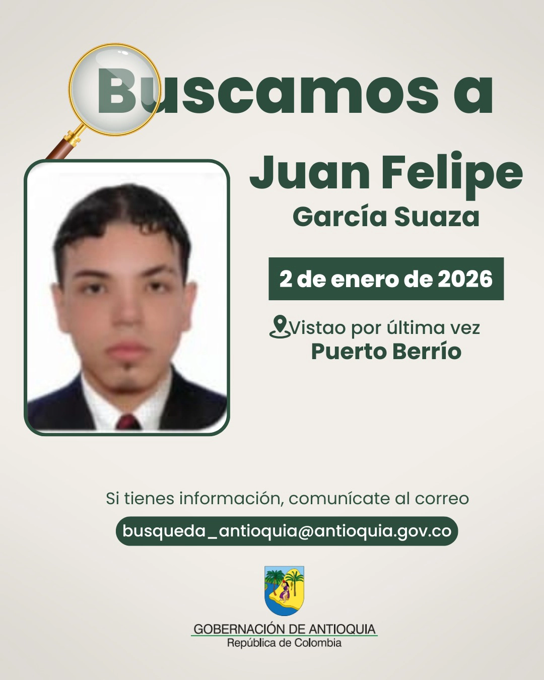 Resumen: Juan Felipe García Suaza ha desaparecido, generando gran preocupación entre sus familiares y conocidos. Se sabe que padece esquizofrenia, lo que aumenta su vulnerabilidad y el riesgo asociado a su desaparición.