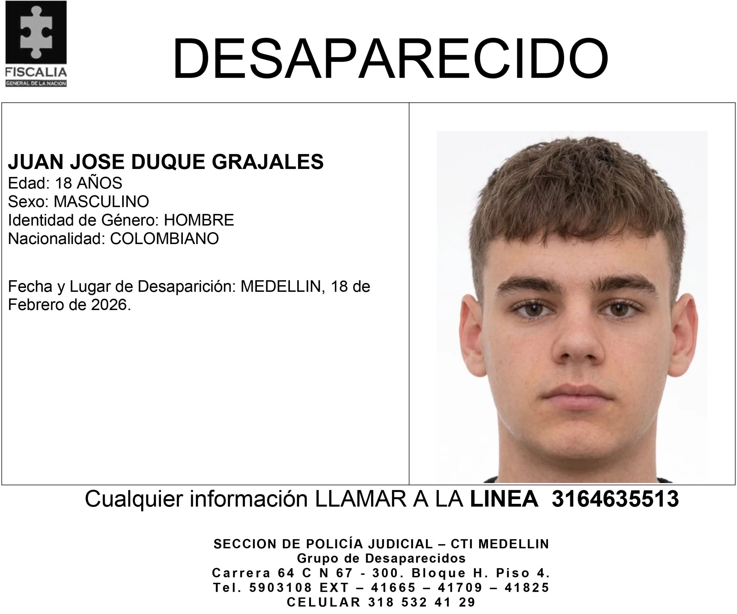 Juan José Duque Grajales es un joven colombiano de 18 años, de sexo masculino e identidad de género hombre. Su información personal básica permite su identificación en el contexto de su desaparición.
