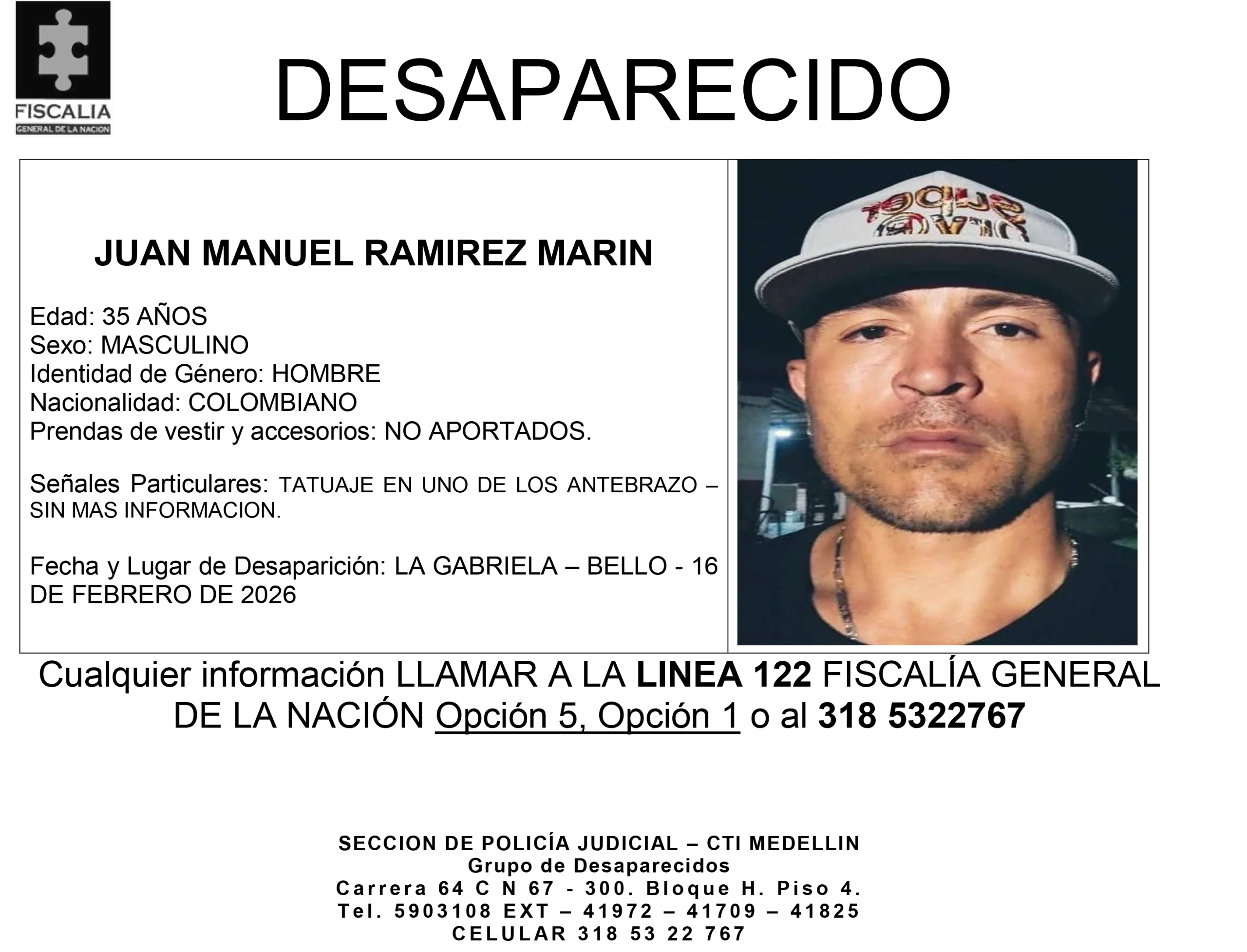 Juan Manuel Ramírez Marín es un hombre colombiano de 35 años de edad. De sexo masculino e identidad de género hombre, no se cuenta con información sobre las prendas de vestir o accesorios que llevaba al momento de su desaparición.