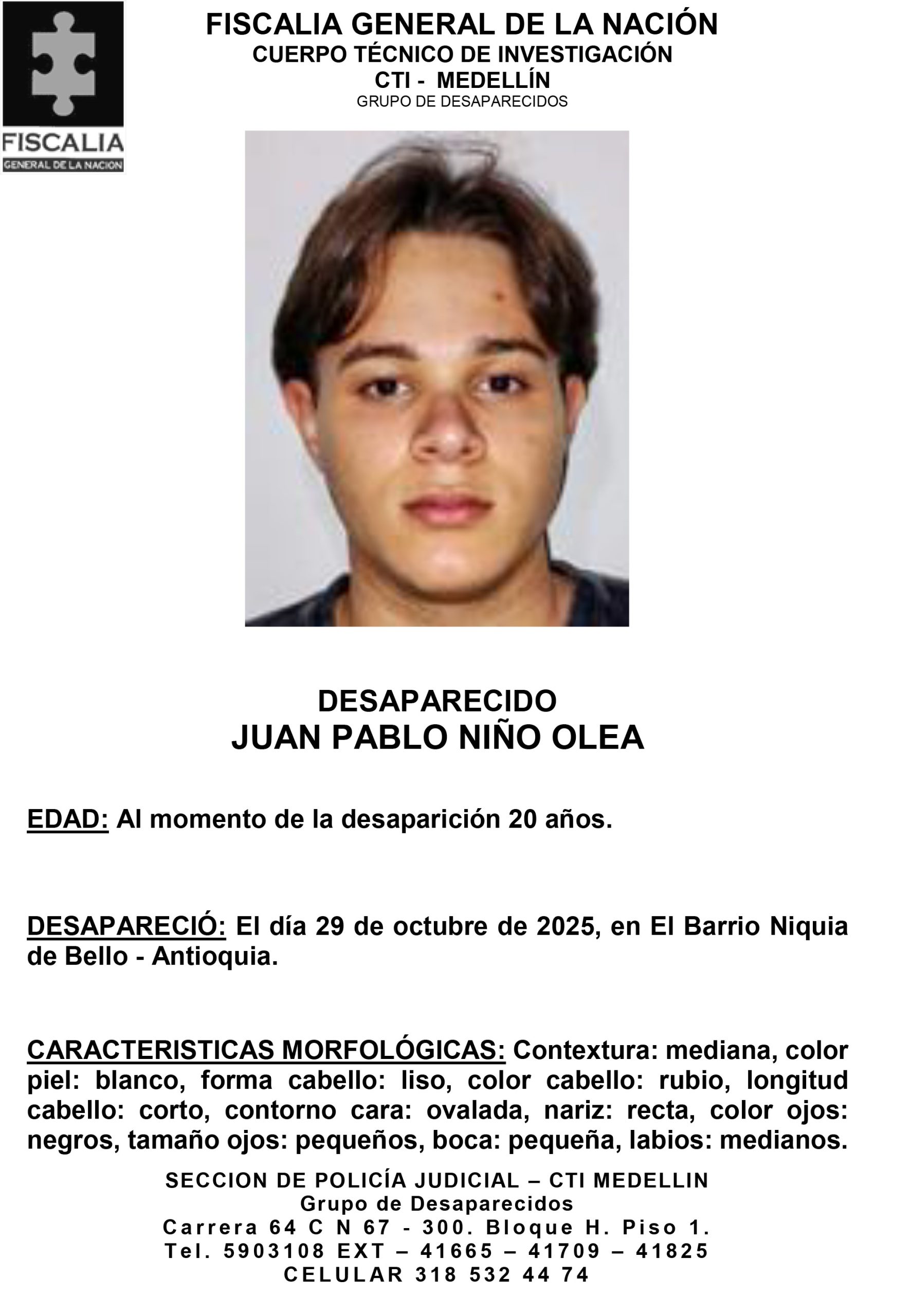 Juan Pablo Niño Olea es un joven de 20 años que desapareció el 29 de octubre de 2025 en el Barrio Niquia, ubicado en Bello, Antioquia.