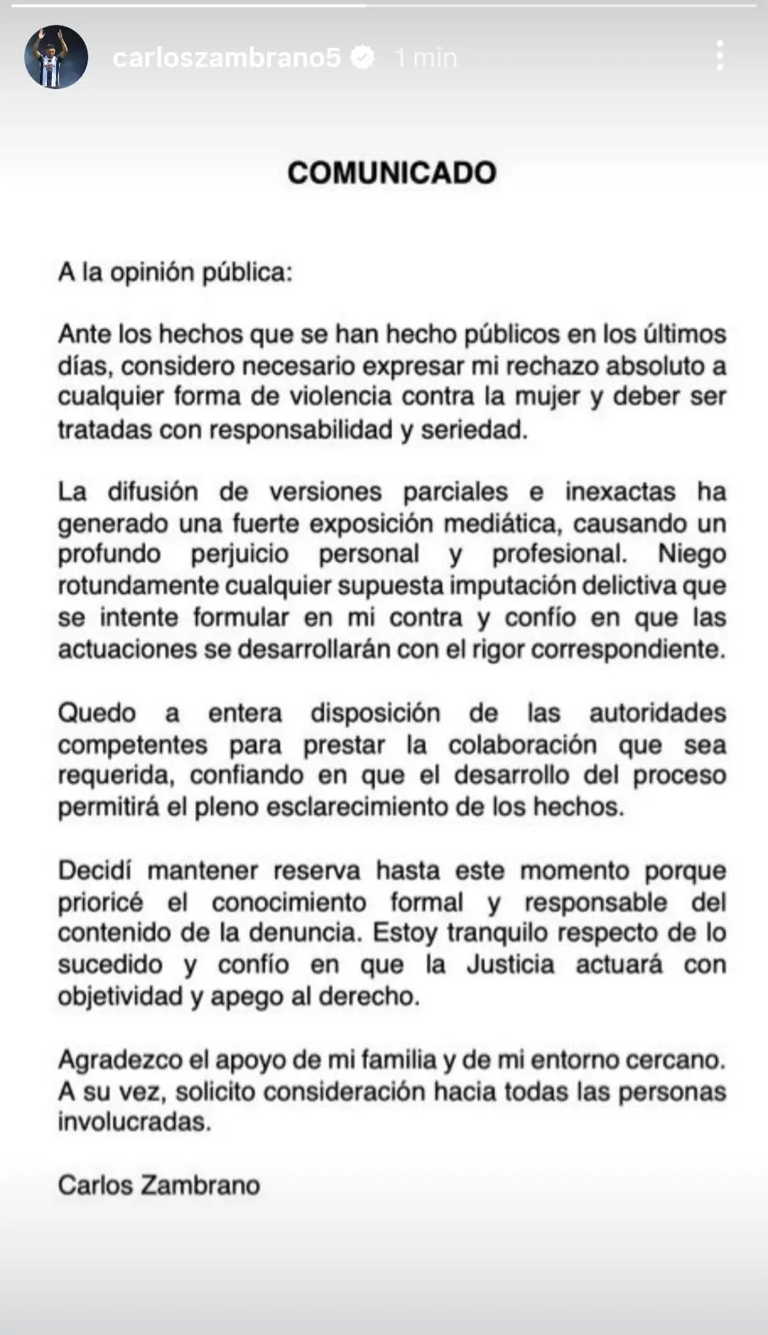 Carlos Zambrano fue enfático al señalar que las versiones difundidas hasta el momento son “parciales e inexactas”, lo cual ha generado un perjuicio mediático significativo a su carrera.