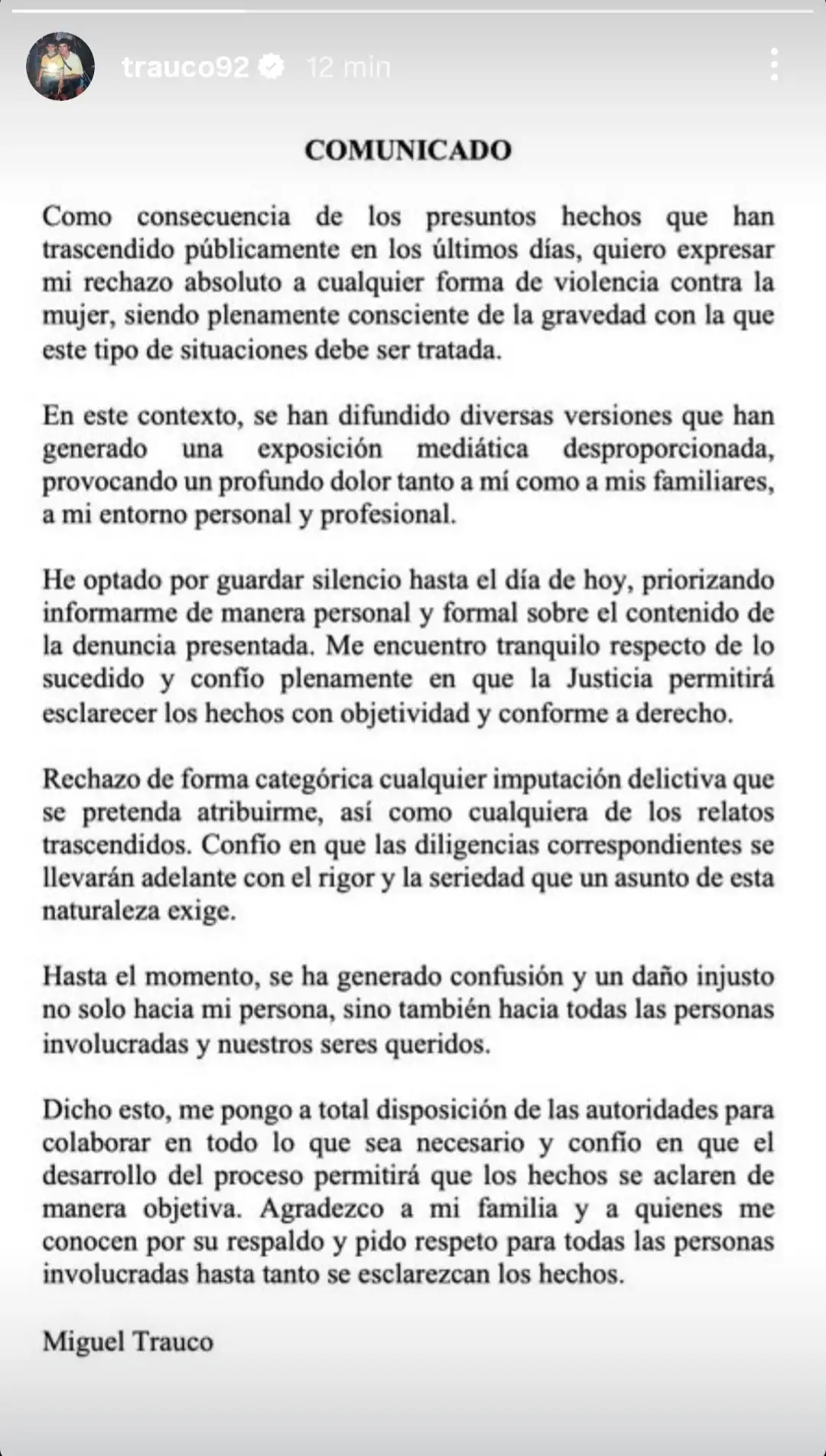 Finalmente, Miguel Trauco lamentó la “exposición mediática desproporcionada” que ha causado dolor en su entorno cercano.