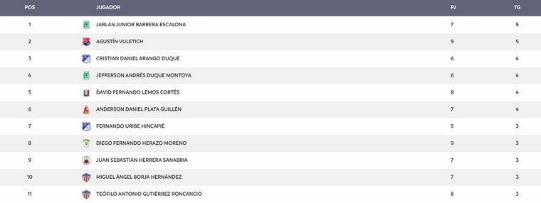 Los mencionados tienen un nutrido pelotón persecutor, con cuatro anotaciones, del que hacen parte: Cristian Arango, Jefferson Duque, David Fernando Lemos y Anderson Plata.