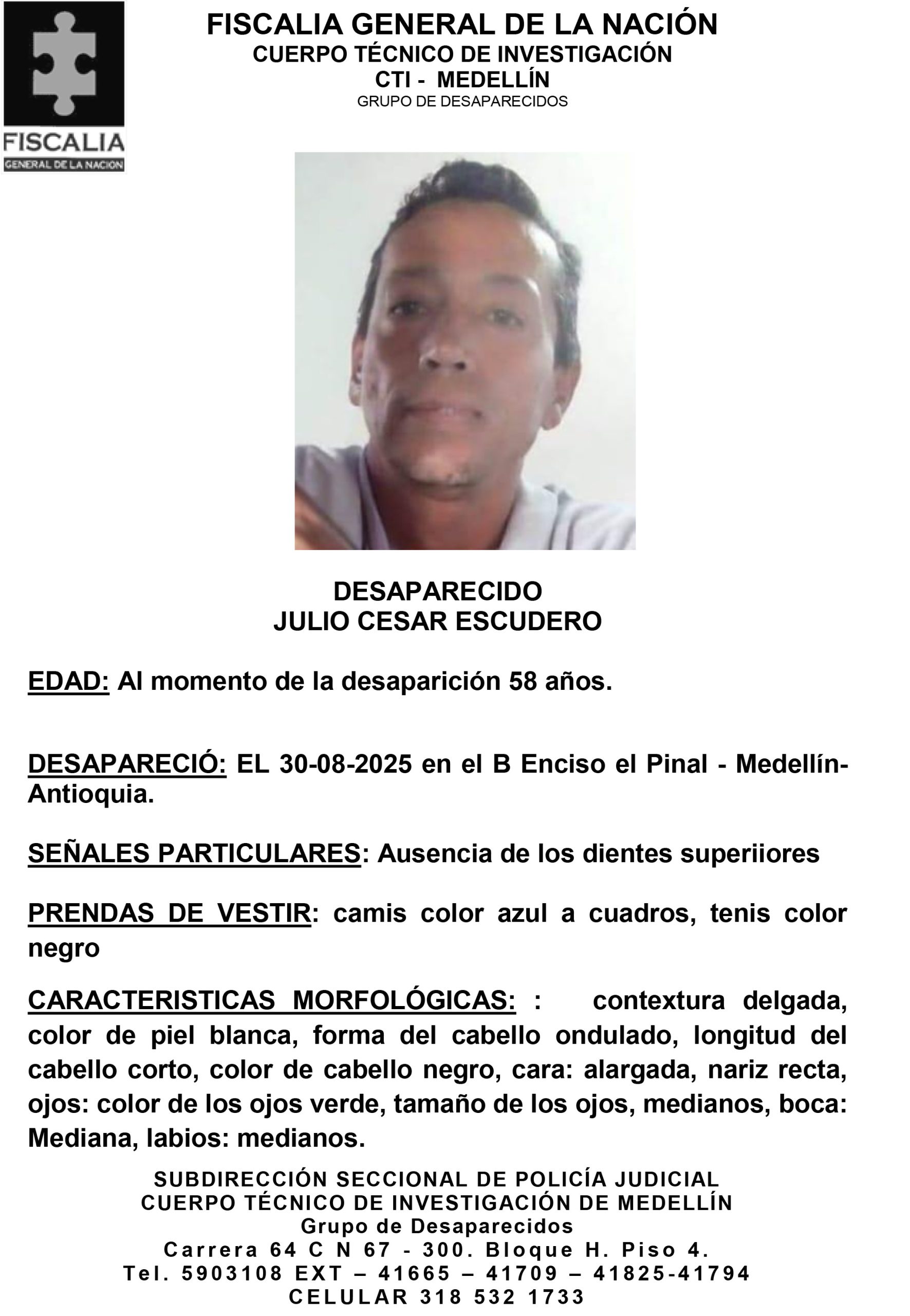 Julio César Escudero, de 58 años, fue reportado como desaparecido el 30 de agosto de 2025 en el barrio Enciso El Pinal, ubicado en Medellín, Antioquia.