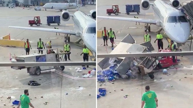 De acuerdo a la aerolínea Envoy, el vehículo estaba cargando el avión de bebidas cuando una caja de botellas de agua se cayó en el pedal, haciendo que el carro acelerara en reversa fuera de control.