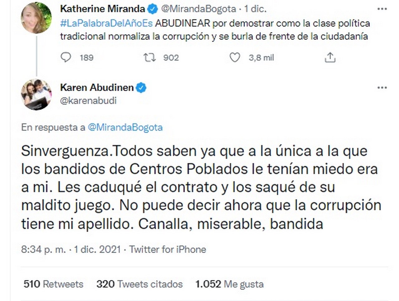 “#LaPalabraDelAñoEs ABUDINEAR por demostrar como la clase política tradicional normaliza la corrupción y se burla de frente de la ciudadanía”, escribió Katherine Miranda, el pasado miércoles 1 de diciembre.