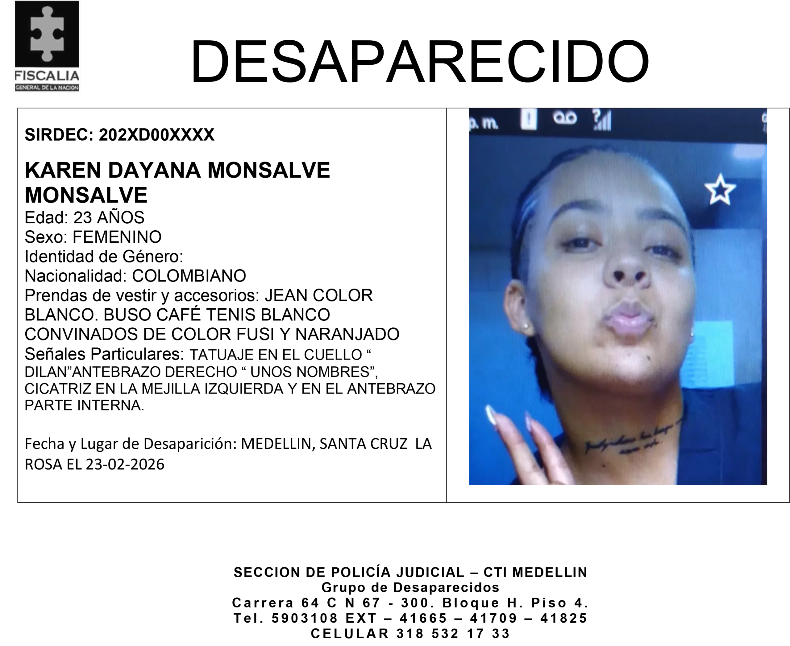 Resumen: Karen Dayana Monsalve Monsalve es una mujer colombiana de 23 años que fue reportada como desaparecida el 23 de febrero de 2026 en el sector Santa Cruz La Rosa, en Medellín. Su caso ha generado preocupación entre familiares y autoridades, quienes buscan información que permita conocer su paradero.