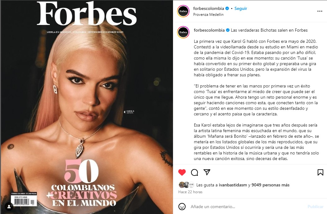 “Gracias @forbescolombia por este artículo tan increíble de nuestra reina, sin duda el valorar y principalmente escribir ✍️ de nuestra carolina de todo ese trabajo duro que ha logrado y por el que ha trabajado tanto sus éxitos se celebran y que mejor forma que hacerlo de esta manera @karolg te amo KG los de siempre.”