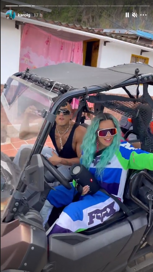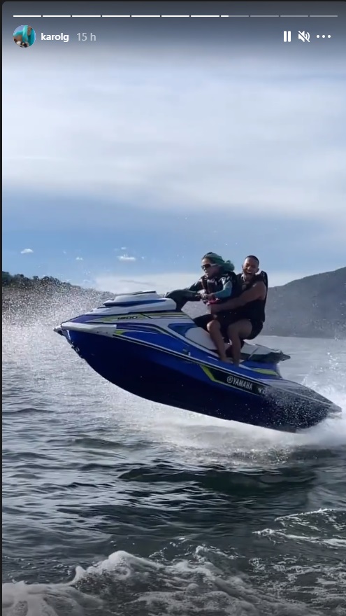 Karol G estuvo disfrutando de una moto acuática en compañía de su papá y demás familiares. su amigo Daiky Gamboa aseguró que como Carolina no era muy activa en las historias, él lo iba a hacer por ella.