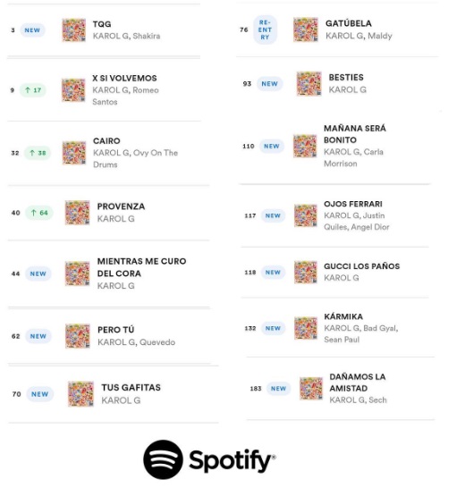 En YouTube, los números siguen creciendo con los segundos, pero respecto a Spotify, Karol ha volado, haciendo que ‘Mañana será Bonito’, obtenga el mayor debut para un álbum femenino en español registrando 32.4M de transmisiones y colocando 14/17 canciones dentro del Top 200 Spotify Global.