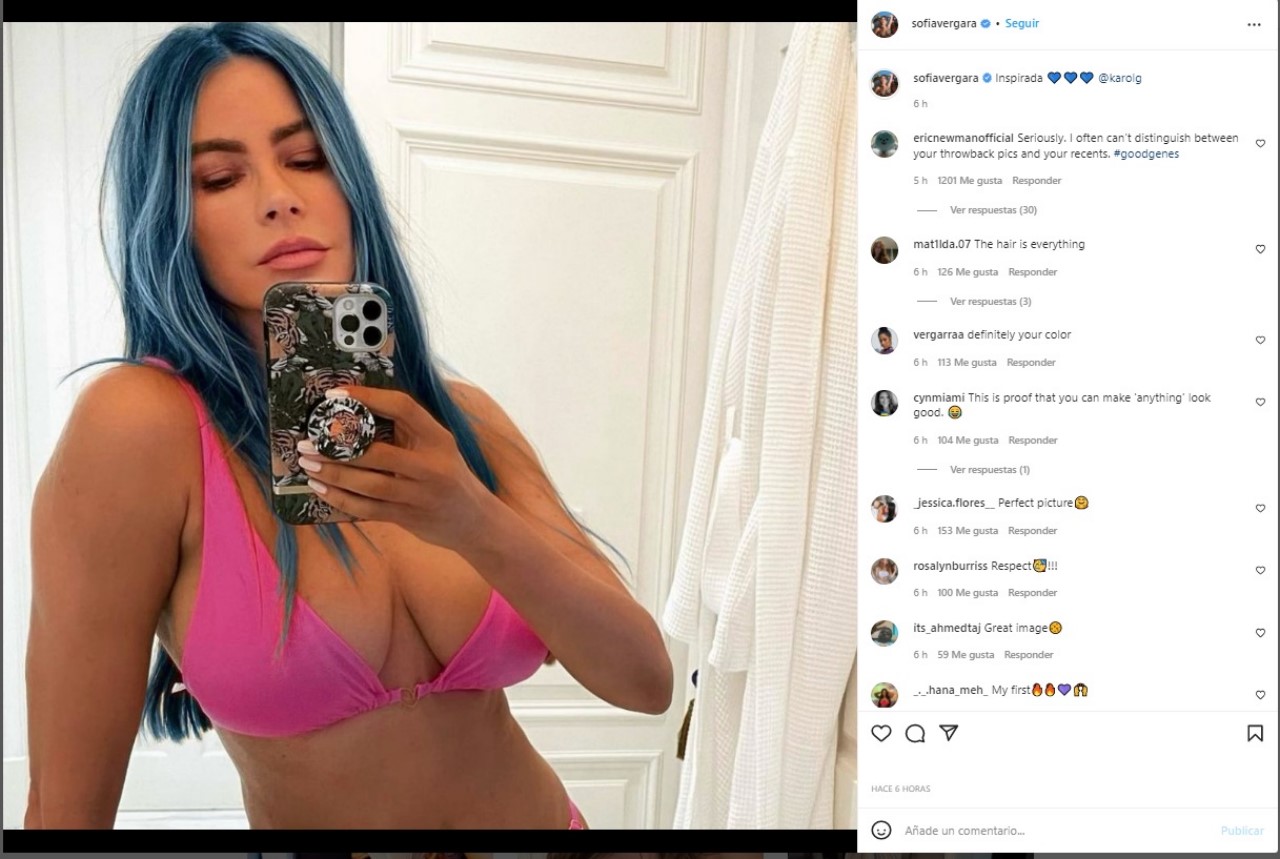 “BICHOTA”, “Espera, no envejeces”, “Absolutamente impresionante”, “Día de los inocentes jajajaja pero te ves increíble con todos los colores”, “Esta es la prueba de que puedes hacer que ‘cualquier cosa’ se vea bien”, son algunos de los comentarios que se pueden leer en el post de Sofía Vergara.