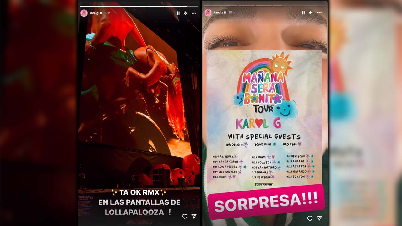 El Dato: Festejando Karol G anunció en sus historias quienes la acompañarán en la Gira “Mañana Será Bonito USA” y son : Agudelo 88 / Young Miko / Bad Gyal. Igualmente celebró verse en las pantallas de Lollapalooza.