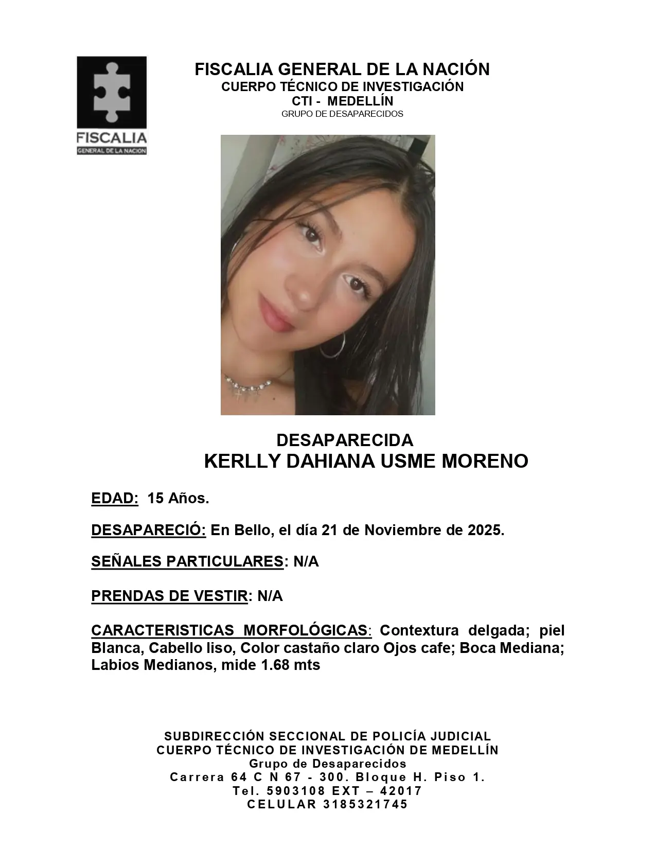 Minuto30.com .- Se solicita la colaboración ciudadana para localizar a Kerlly Dahiana Usme Moreno, una adolescente de 15 años de edad que se encuentra desaparecida desde el pasado 21 de noviembre de 2025 en el municipio de Bello, Antioquia.
