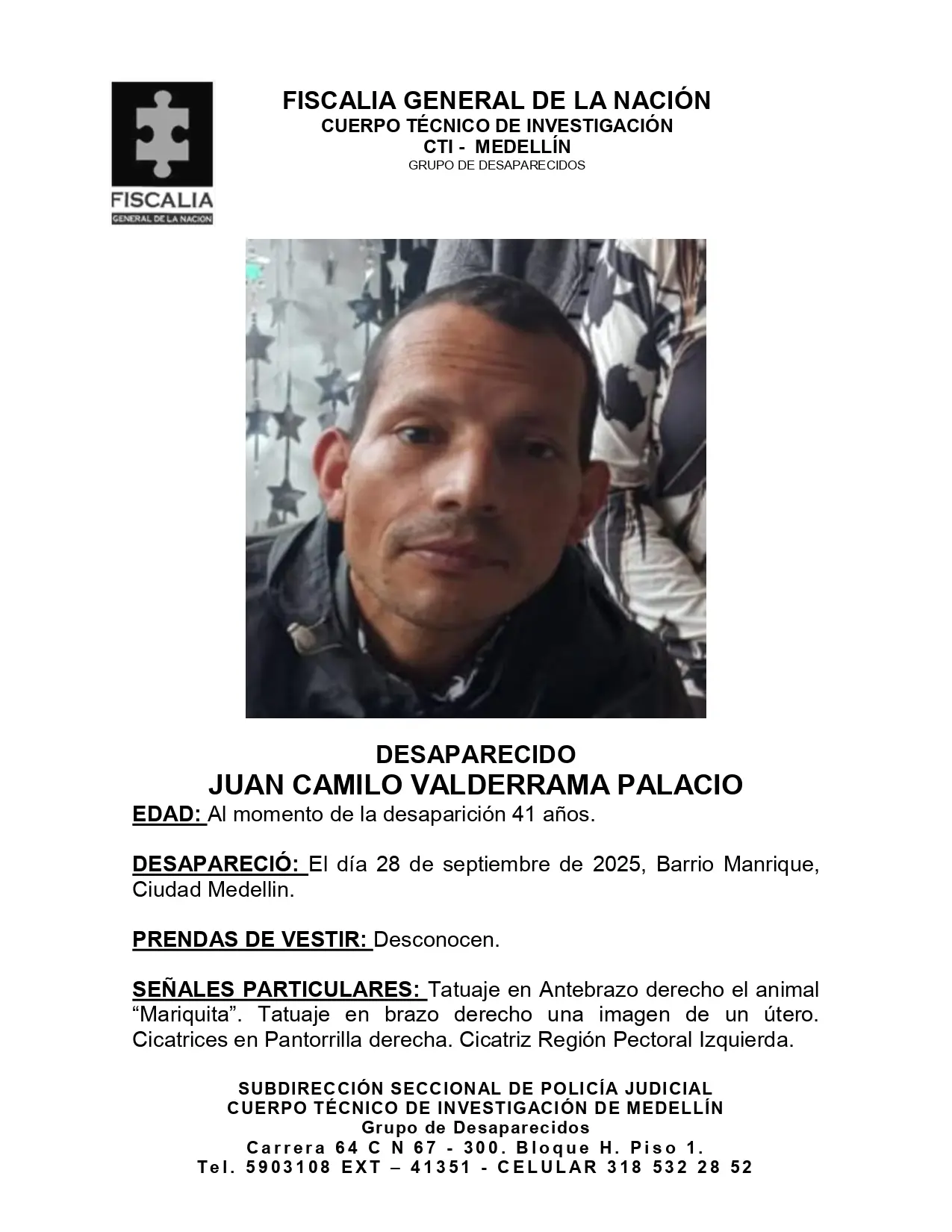 Minuto30.com .- Juan Camilo Valderrama Palacio, un hombre de 41 años de edad, se encuentra desaparecido desde el pasado 28 de septiembre de 2025 en el barrio Manrique de Medellín. La Fiscalía General de la Nación ha emitido una alerta de búsqueda.