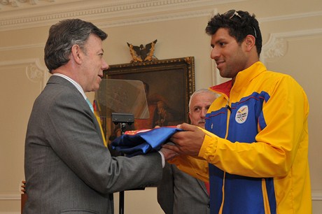 Casa de Nariño, Bogotá - 5 de junio de 2012 Foto: César Carrión - SIG El Presidente Juan Manuel Santos entregó la Bandera de Colombia a los deportistas nacionales que participarán en los Juegos Olímpicos de Londres 2012. El nadador Omar Pinzón fue el encargado de recibir el pabellón nacional, durante una ceremonia realizada este martes en la Casa de Nariño.