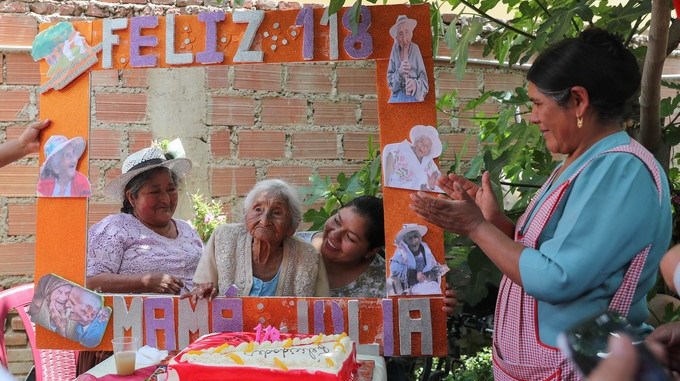 Julia Flores, considerada la mujer más longeva de Bolivia y probablemente del mundo, celebró hoy sus 118 años en medio de reconocimientos de autoridades, regalos y una gran fiesta familiar rodeada de quienes quieren que el récord Guinness la reconozca como la mujer más anciana del planeta.