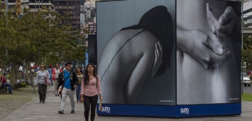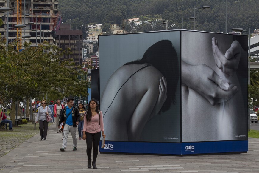 Fotografía del 6 de abril del 2015 de personas caminando junto a imágenes de la fotógrafa mexicana Karina Juárez en un bulevar en Quito (Ecuador). EFE