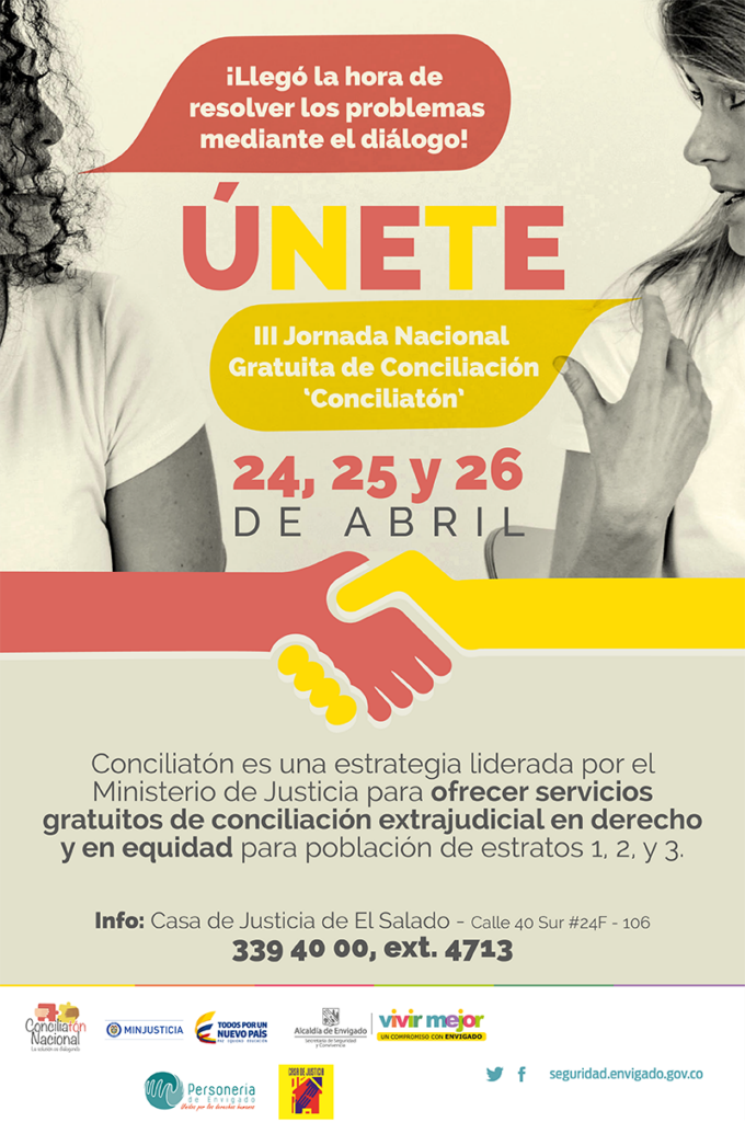 La Jornada Nacional Gratuita de Conciliación, “Conciliatón”, es una estrategia liderada por el Ministerio de Justicia para ofrecer servicios gratuitos de conciliación extrajudicial en derecho y en equidad para población de estratos 1,2 y 3. La iniciativa se estará realizando el 24,25 y 26 de abril en la Casa de Justicia de El Salado, en el […]
