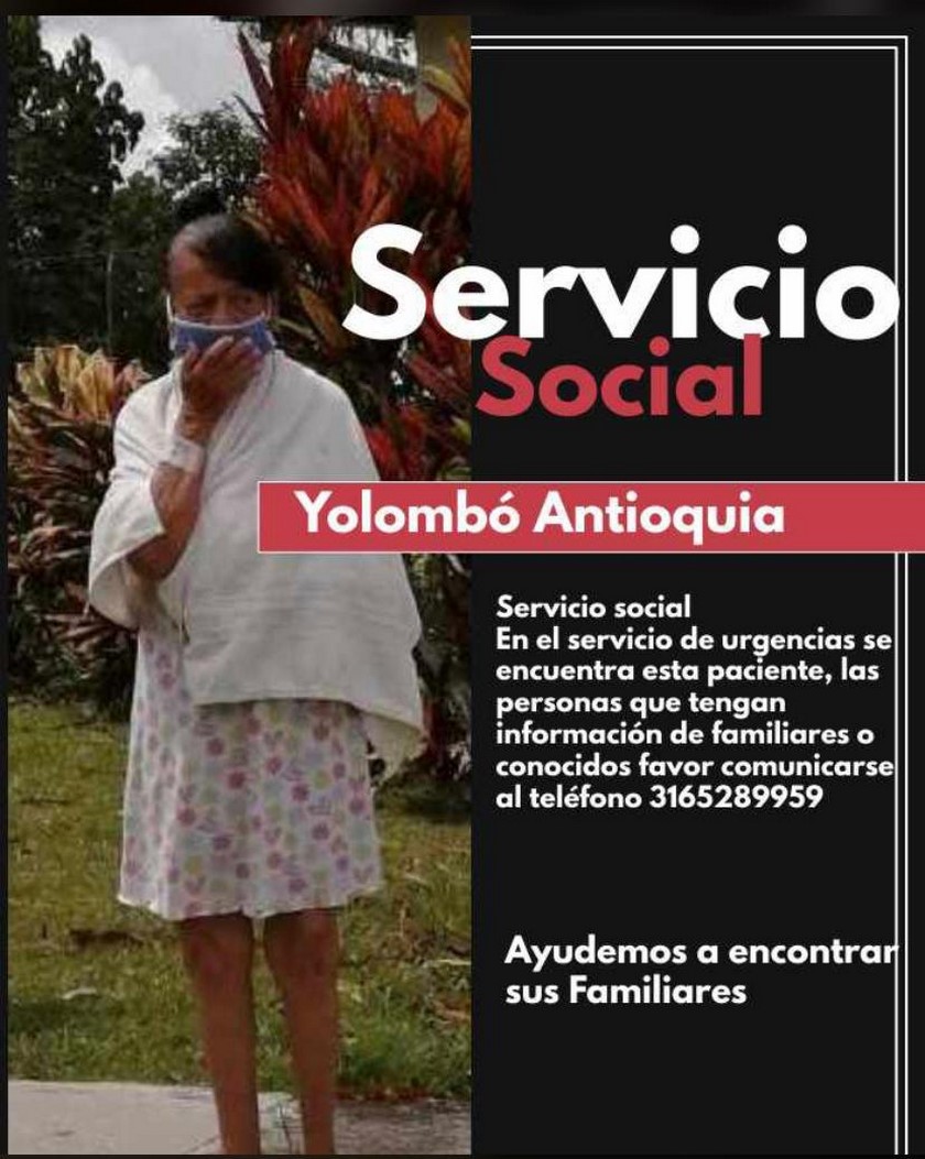 En el Hospital San Rafael del municipio de Yolombó, Antioquia, se encuentra la señora Luz Mirian Londoño de 70 años de edad, quien llegó desorientada y por sus propios medios al municipio. La mujer no se ubica en tiempo, modo, lugar y tampoco recuerda donde es su hogar. Según informó la entidad, el Sisben de […]