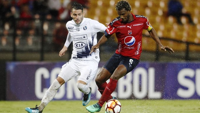 Didier Moreno (d) de Independiente Medellín disputa un balón con Martín Giménez (i) de Sol de América