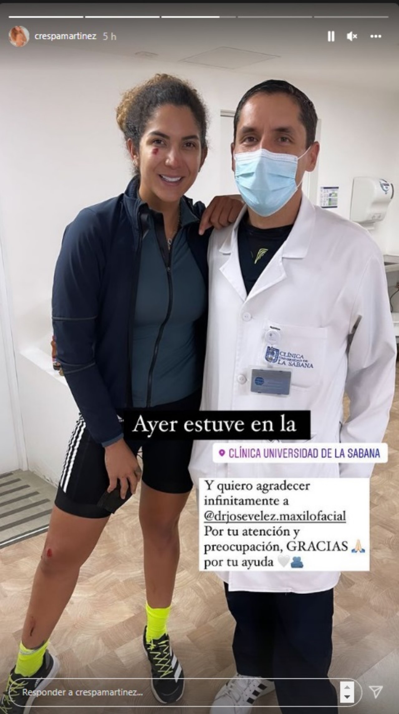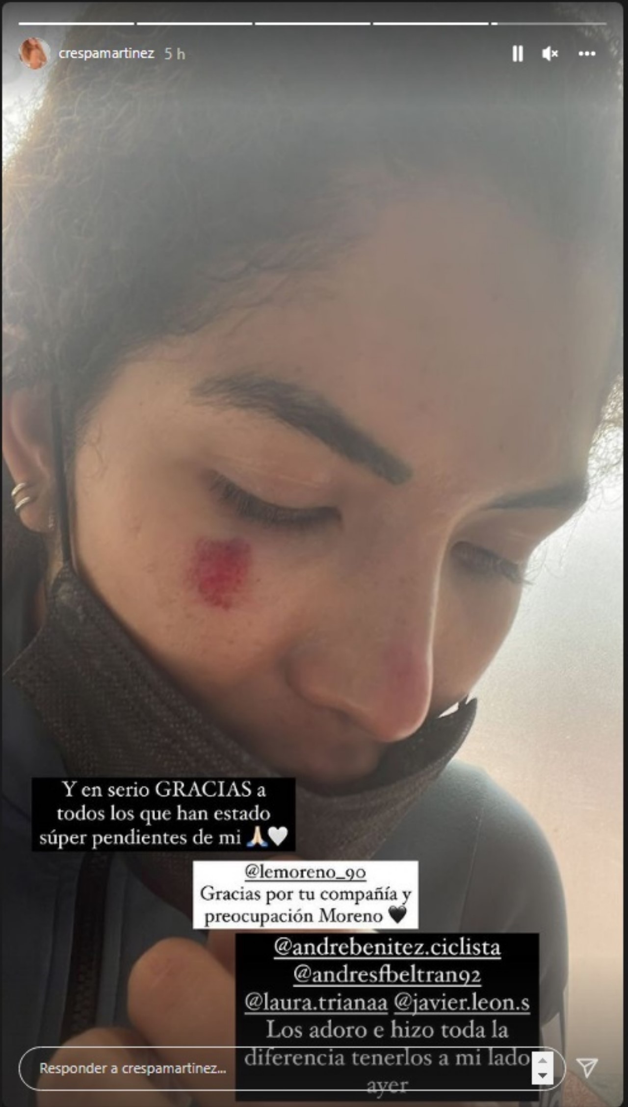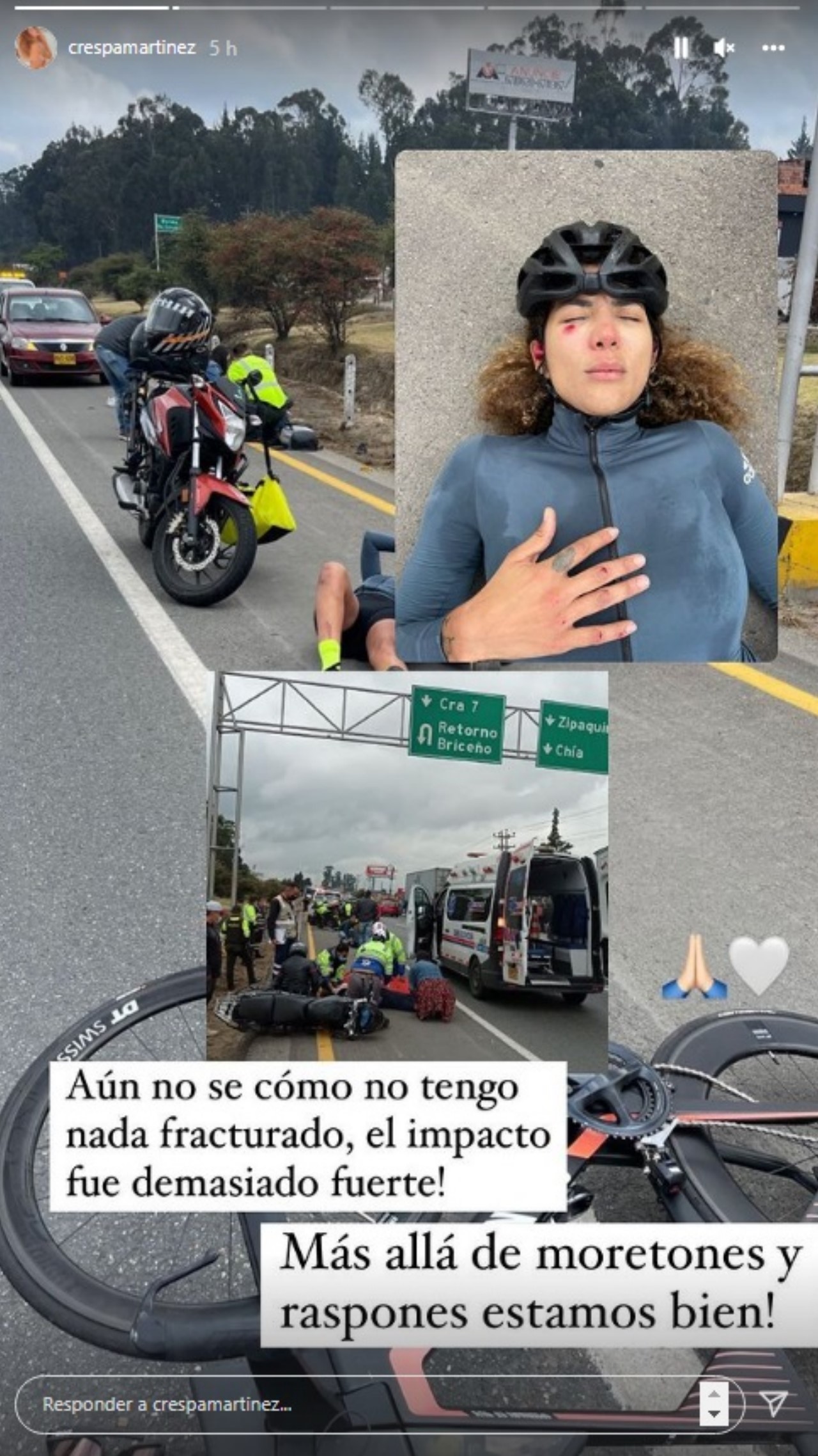 De acuerdo con lo que mostró en sus historias, ‘La Crespa’ Martínez entraba por la autopista norte de Bogotá. “Les cuento que tuve un accidente en mi bici entrando a Bogotá y el susto fue demasiado grande. Gracias a Dios no fue fatal y los involucrados estamos vivos”, escribió la mujer.